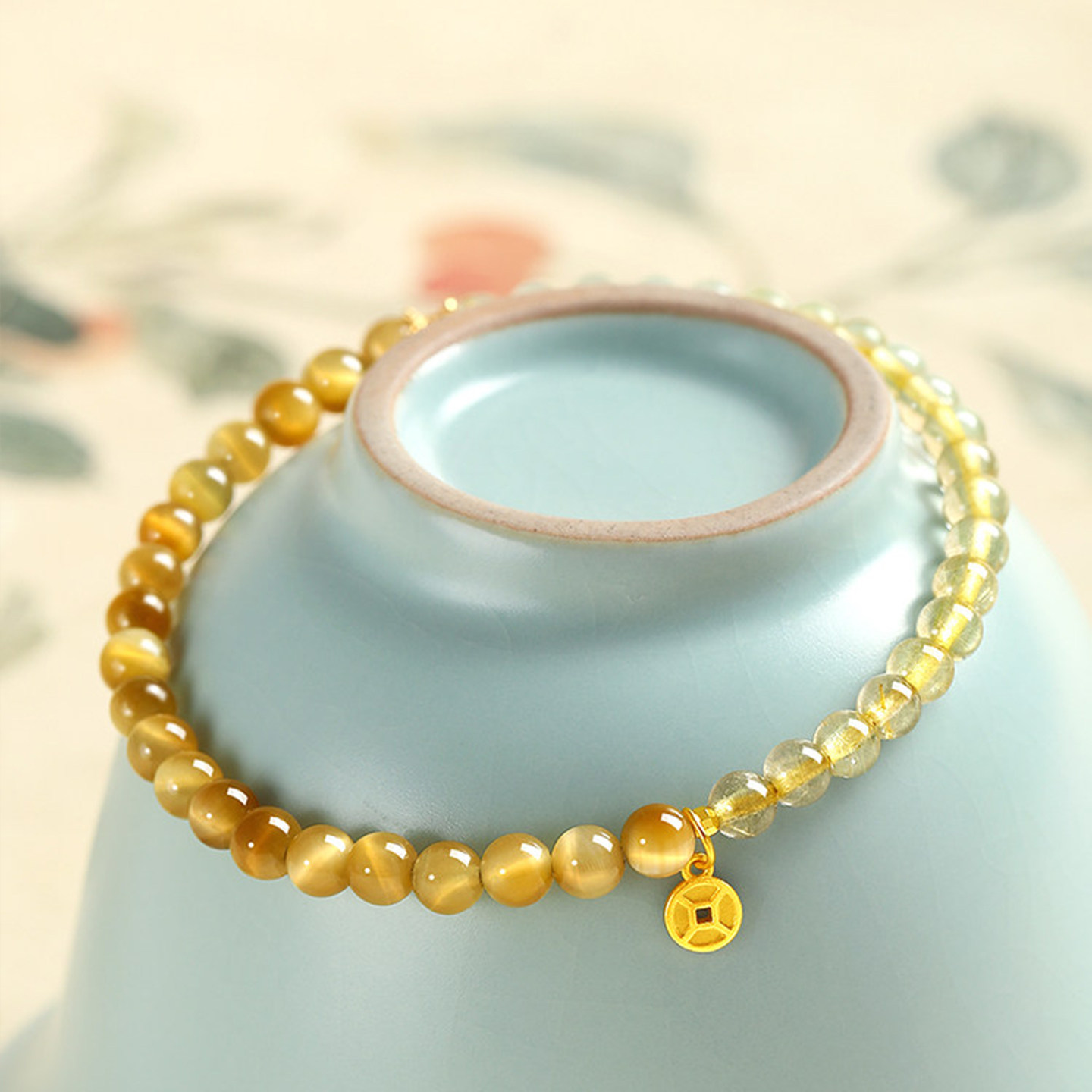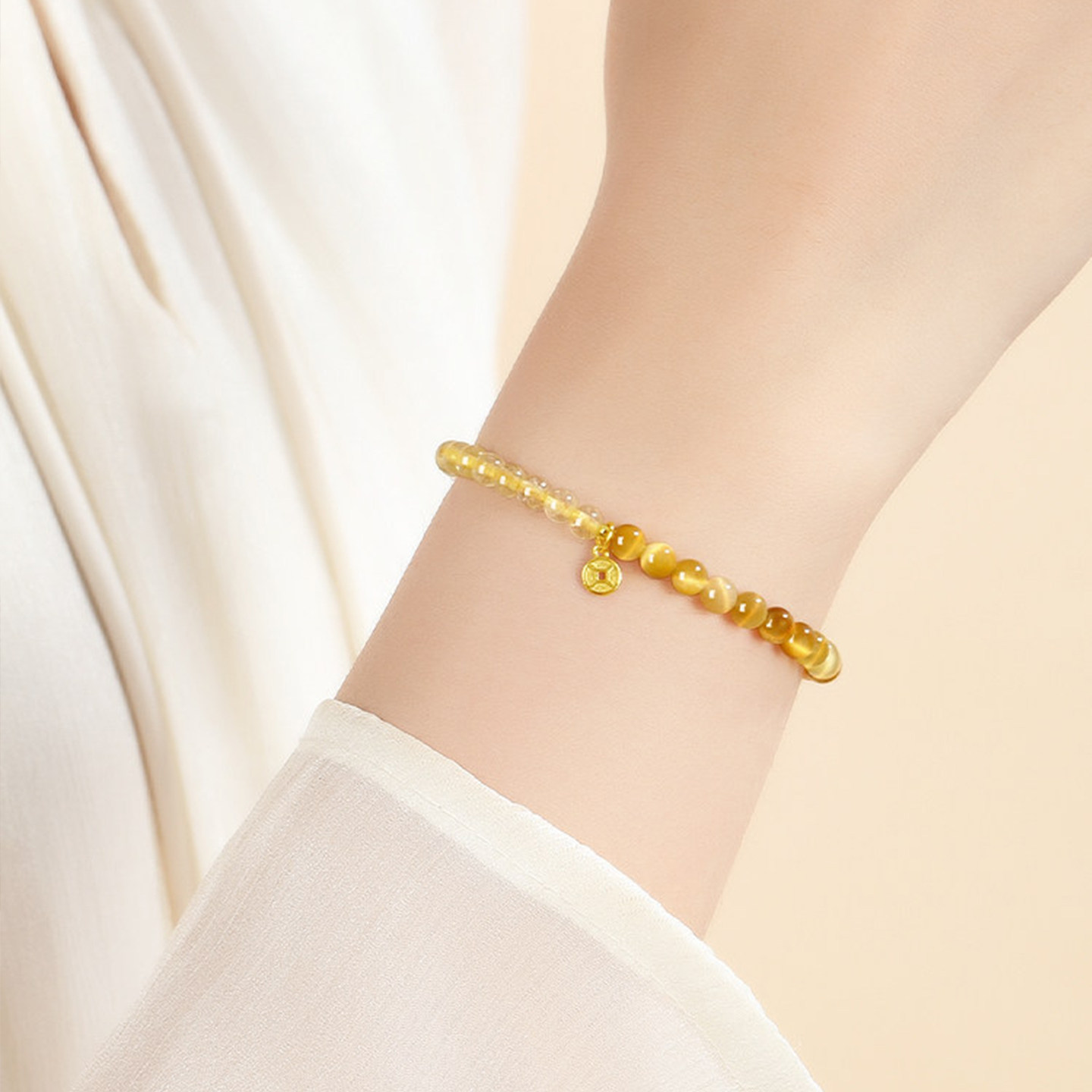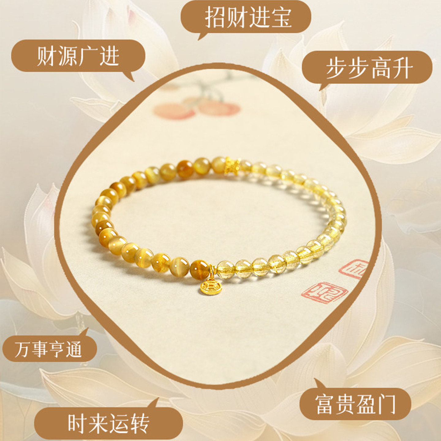 天然金发晶手串女款纯银招财转运珠黄水晶手链黄色旺财运金虎眼石