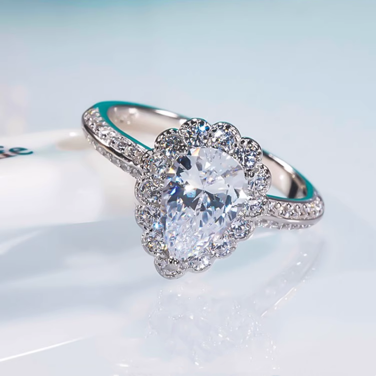PT950铂金D色莫桑石豪华水滴满钻戒指纯银花边梨形钻戒女时尚精致