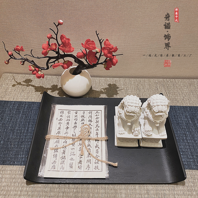 新中式弧形托盘古书莲花柿子摆件搭配样板房间售楼处书房软装饰品