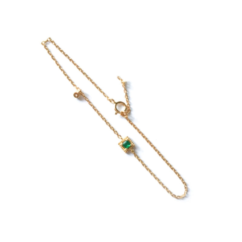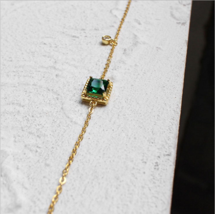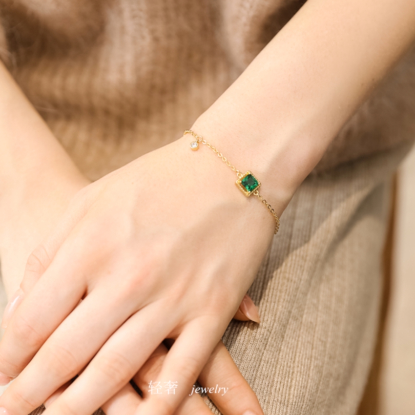 复古方形祖母绿宝石手链 纯银镀黄金色女方糖钻石手镯手环沙弗莱