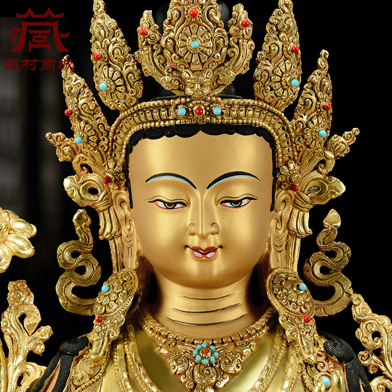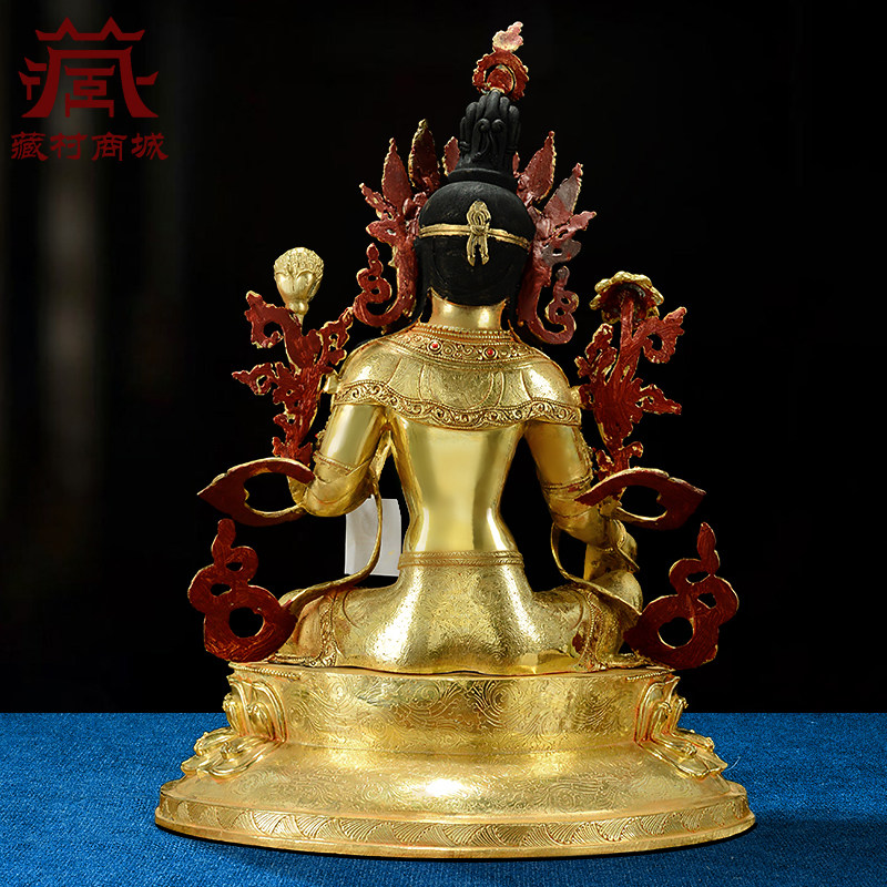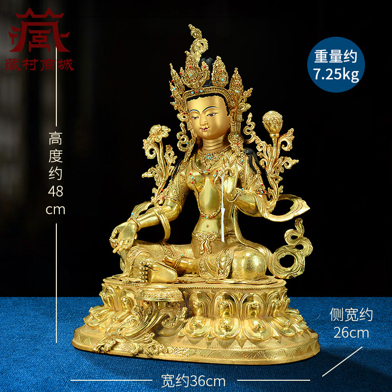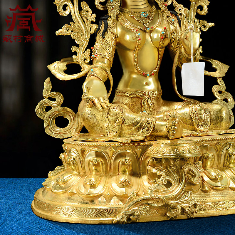 全鎏金《绿度母》宝石镶嵌精工铜雕花室内家用《度母》铜像摆件