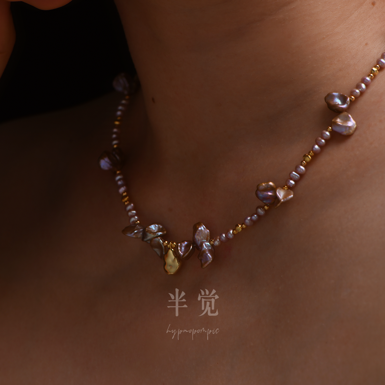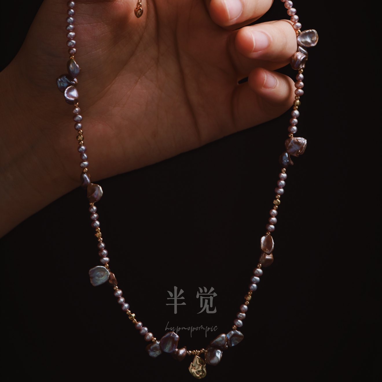 半觉炫彩莫奈紫keshi花瓣穿插紫色米珠纯银爆闪球配件珍珠项链