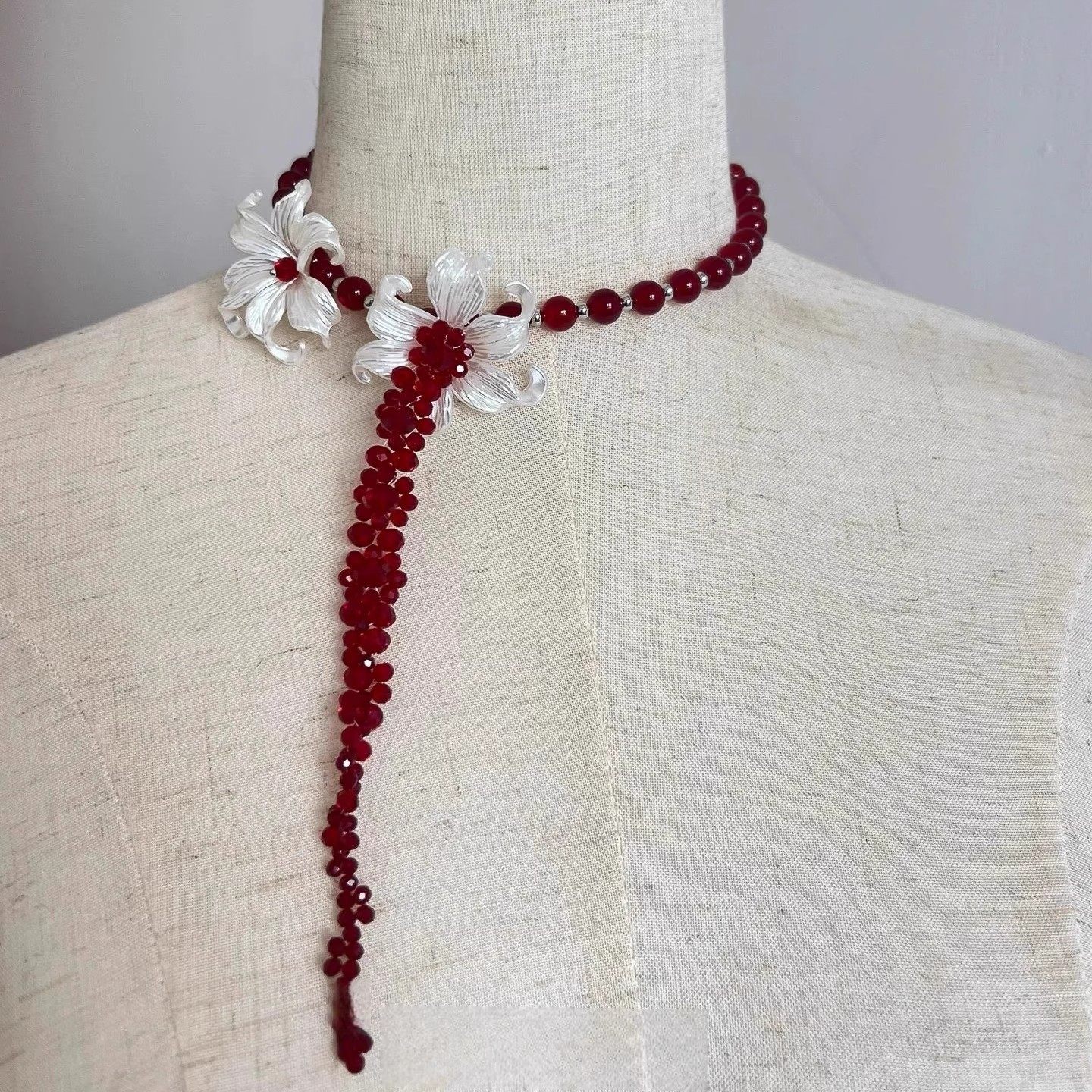 复古高级感鸢尾花红色串珠项链耳环女颈链小众流苏锁骨链耳钉配饰