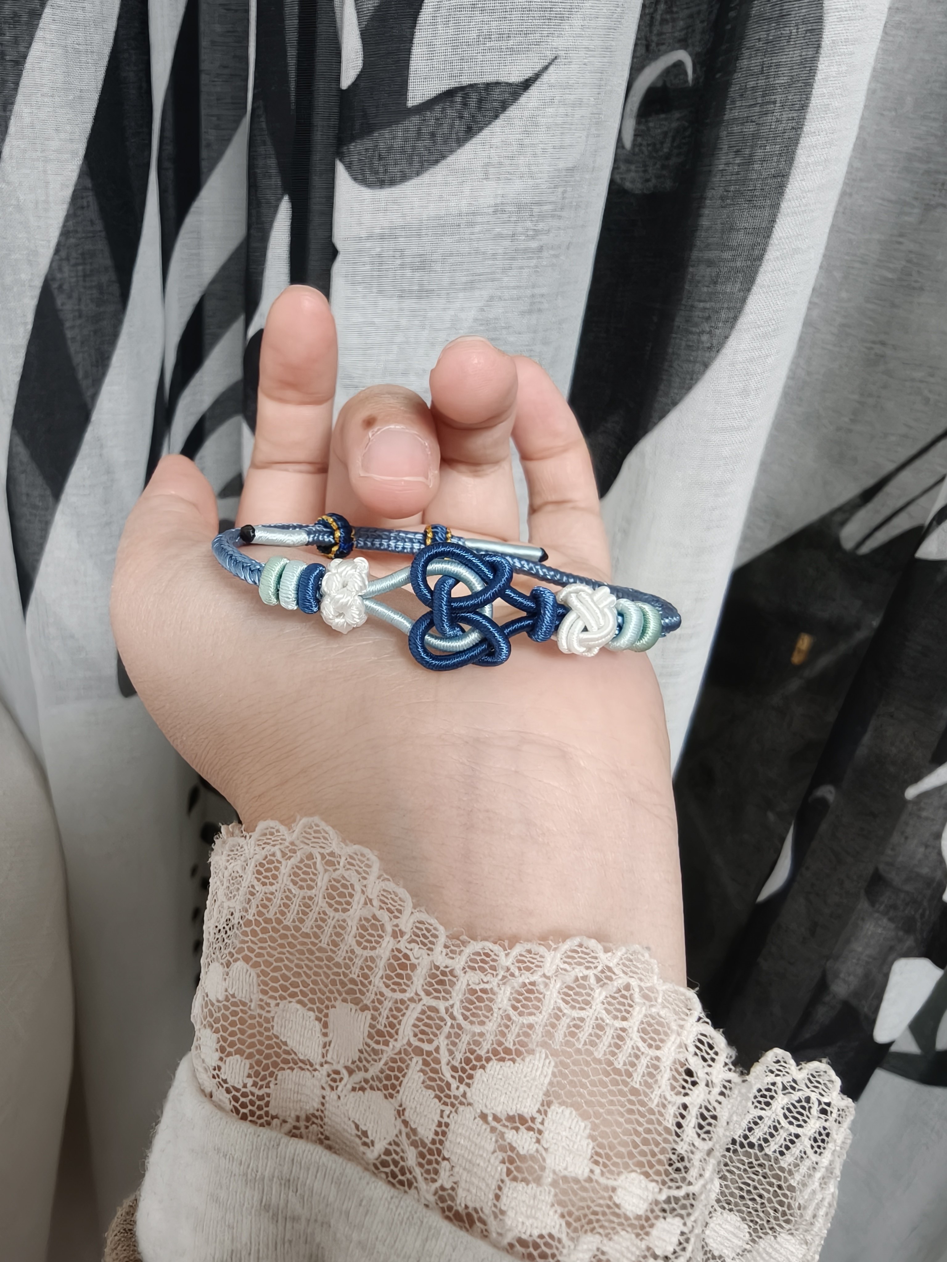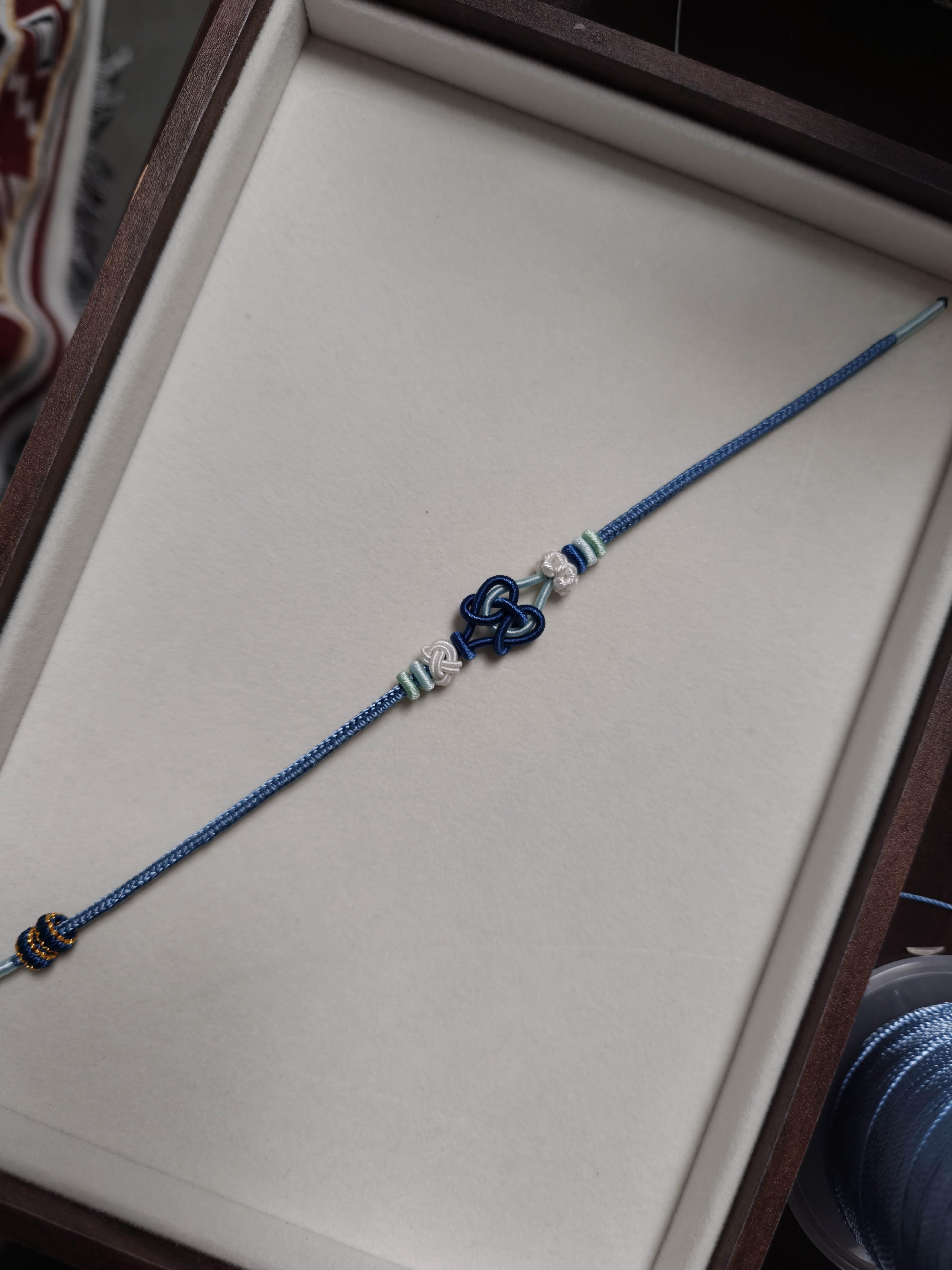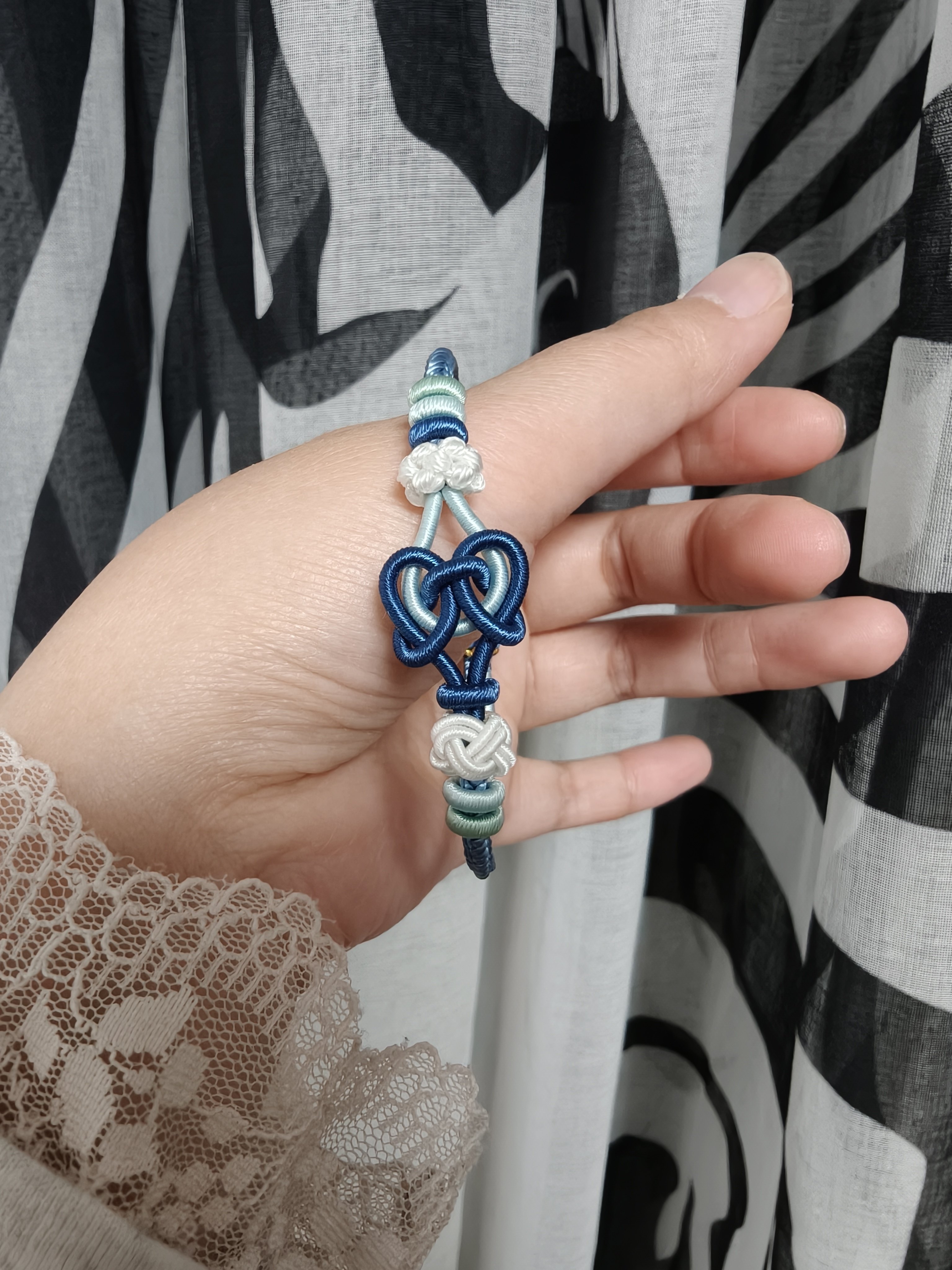 纯手工编绳桃花结手绳藏蓝色并蒂同心结情侣款转运珠礼物可调节绳