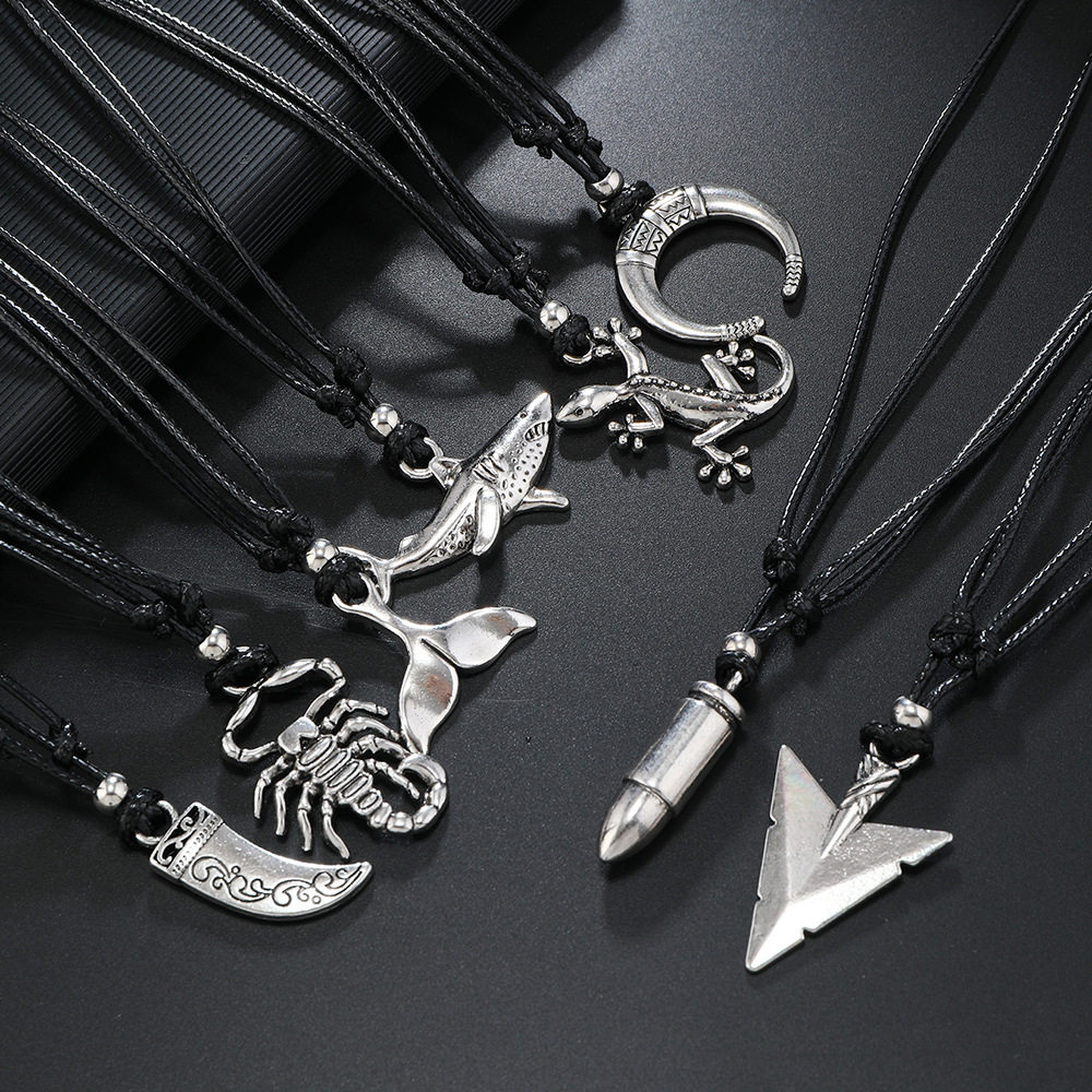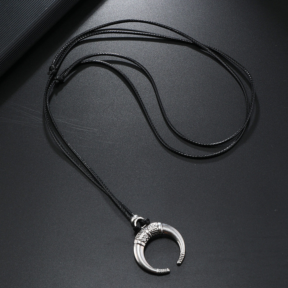 新品 欧美简约复古子弹头牛角动物男士项链 黑色绳子项链