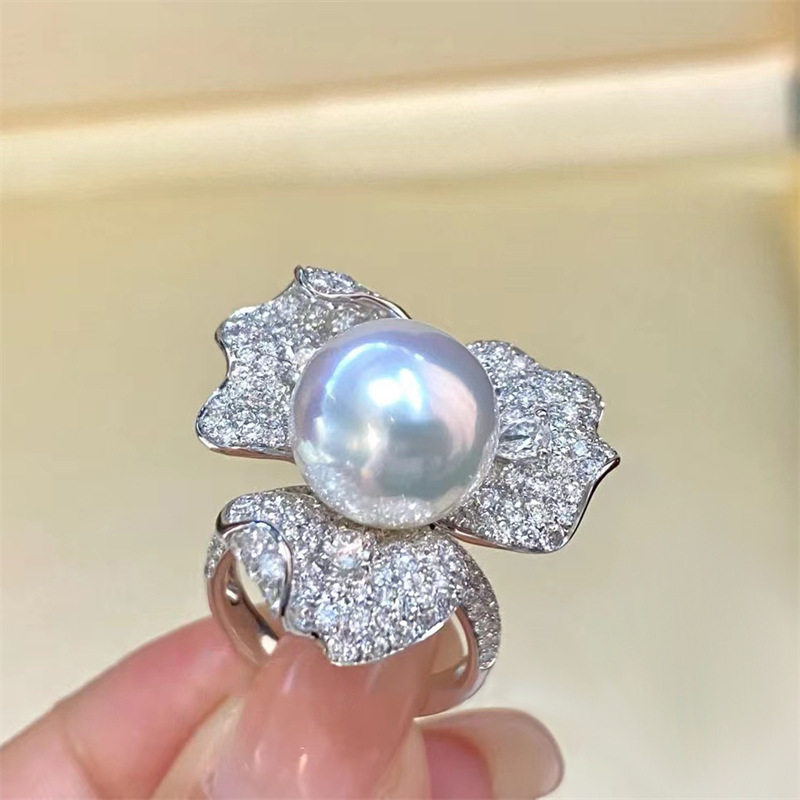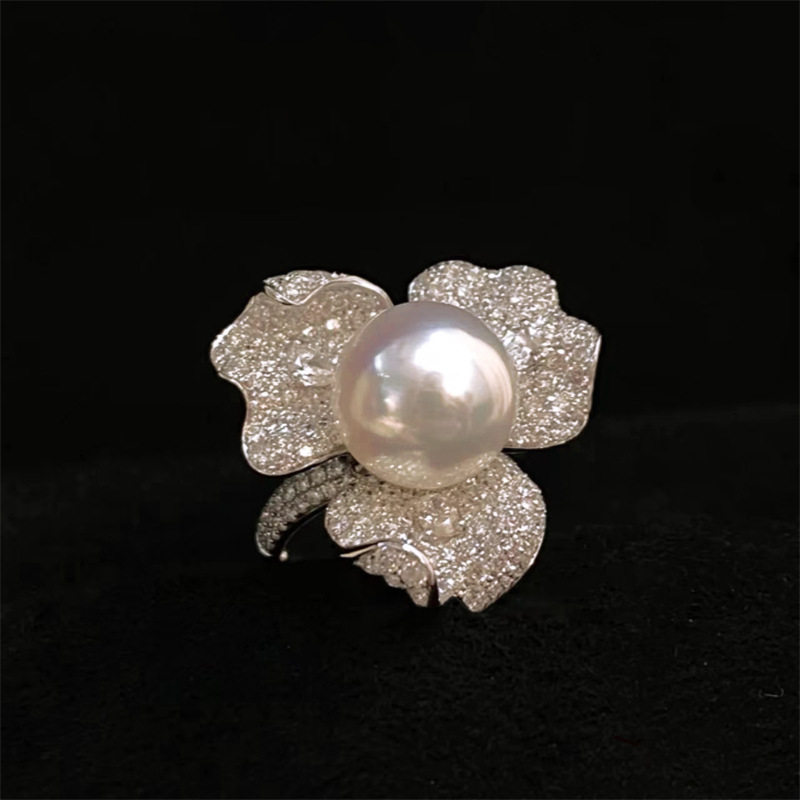 优雅气质淡水珍珠戒指女开口可调节满钻精工法式复古三花朵高级感