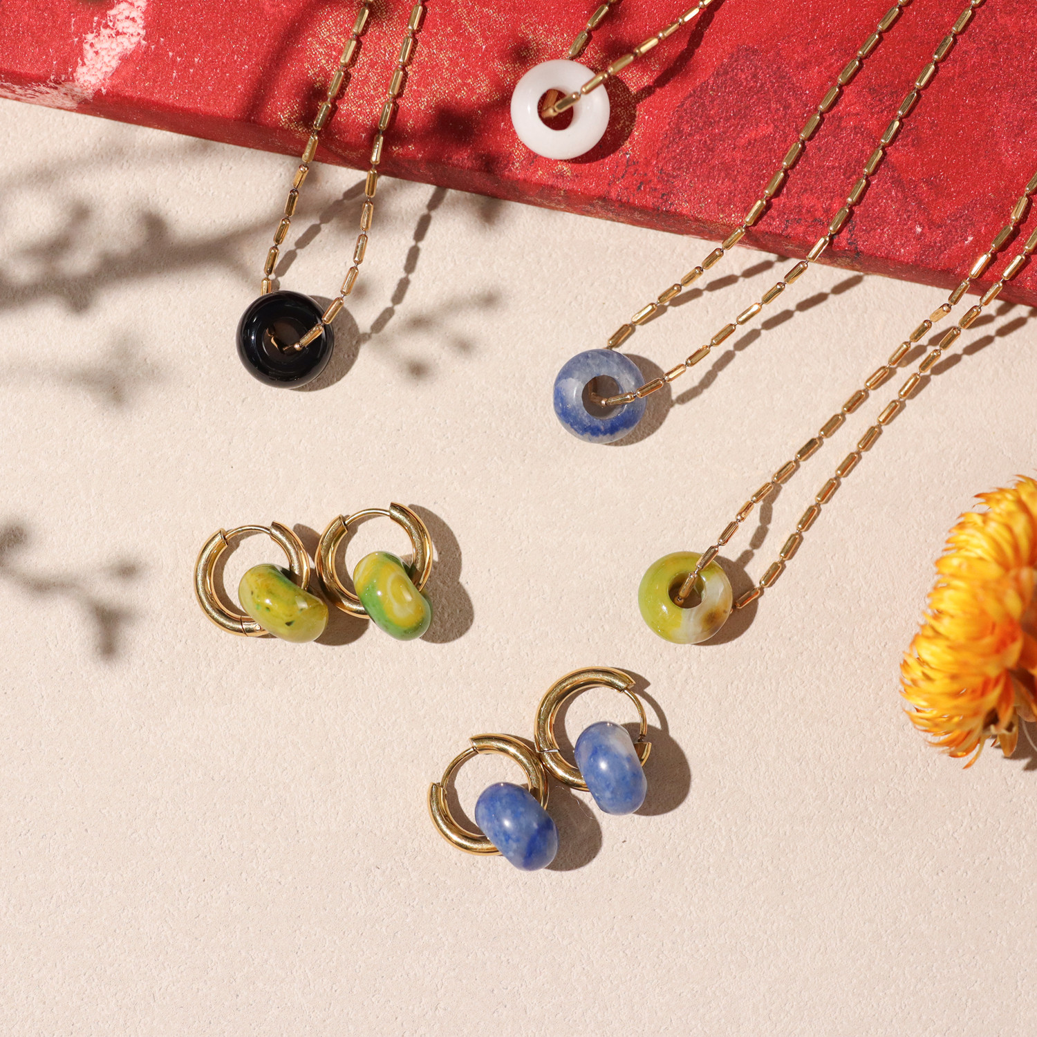 巴黎LITCHI正品天然石白黑蓝绿色玛瑙可爱甜度满分甜甜圈项链耳圈