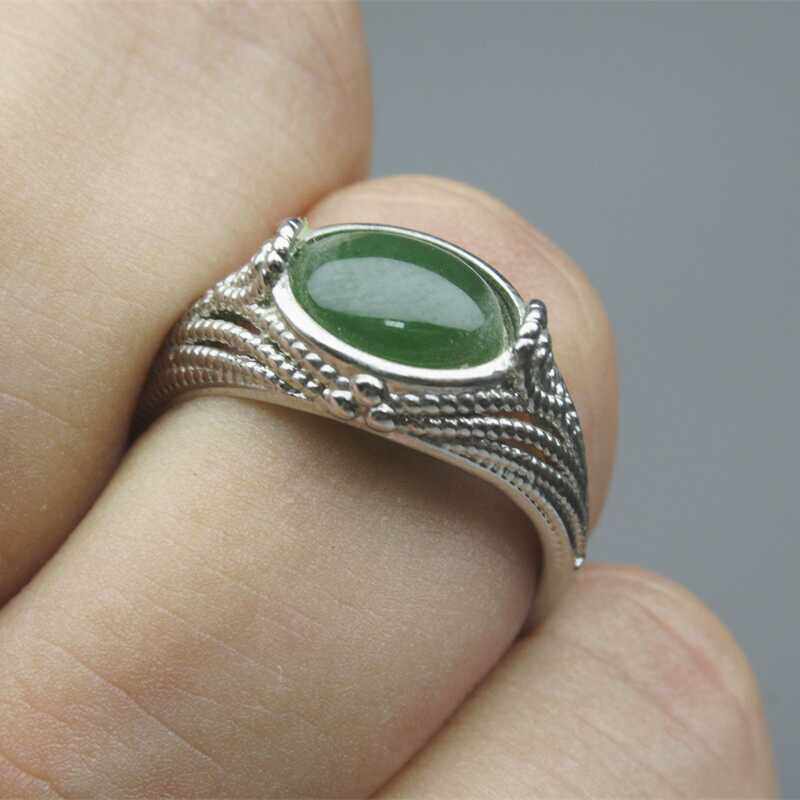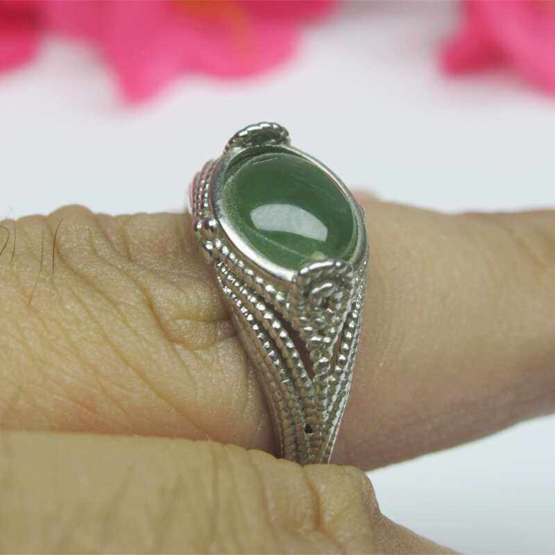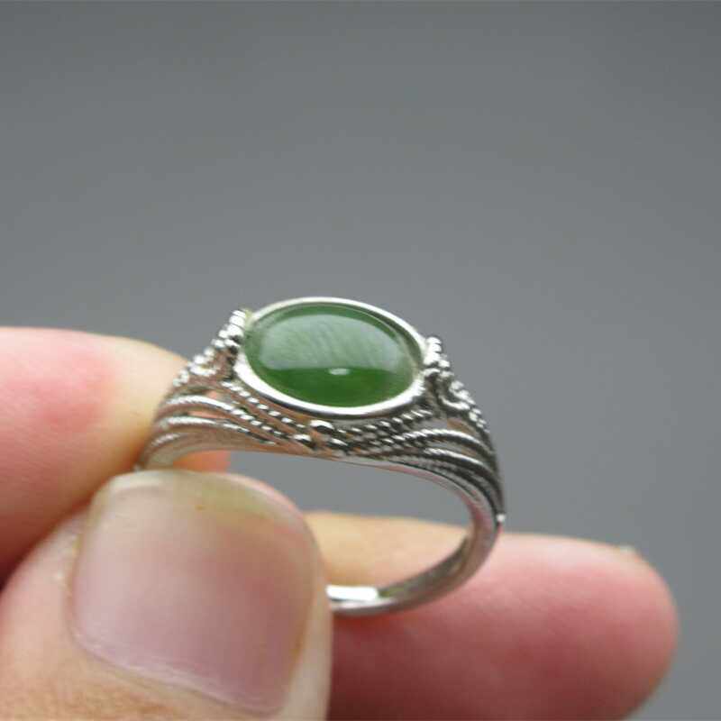 俄罗斯碧玉925银镶嵌戒指天然玉石和田玉女款全新活扣可调节证书