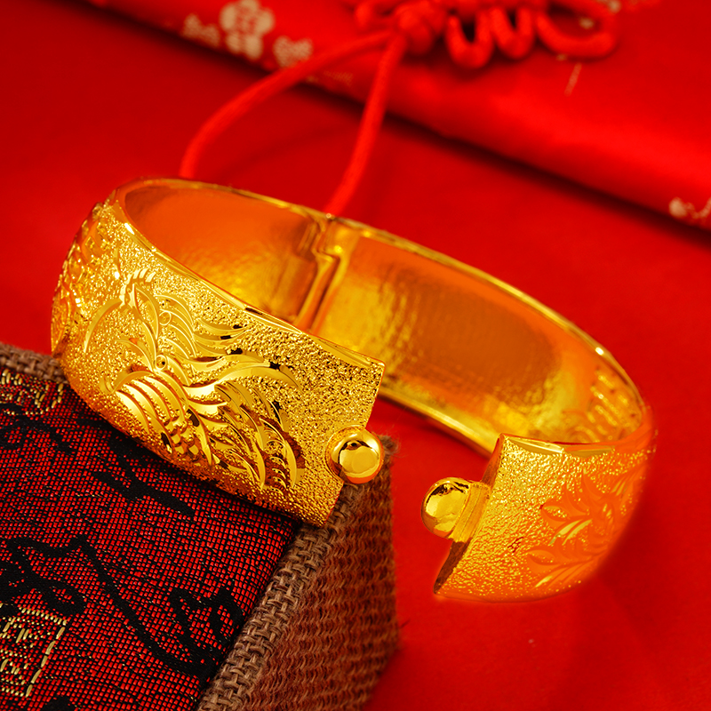 高仿真金婚庆双喜对镯新娘女款沙金卡扣手镯镀金实心龙凤镯子首饰