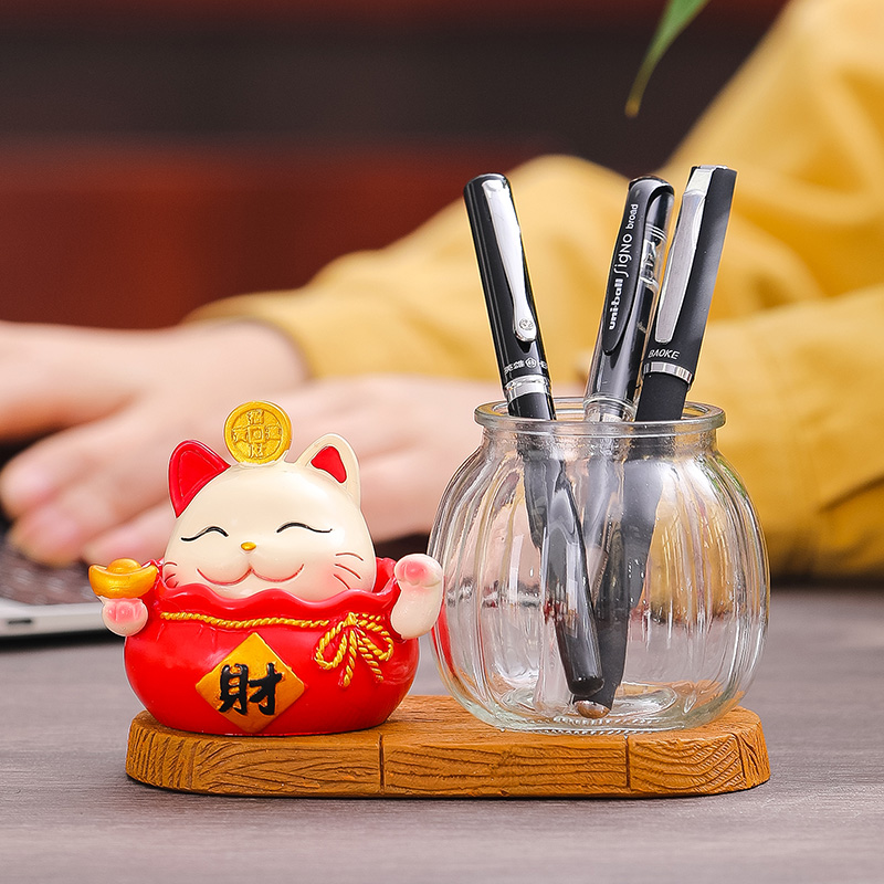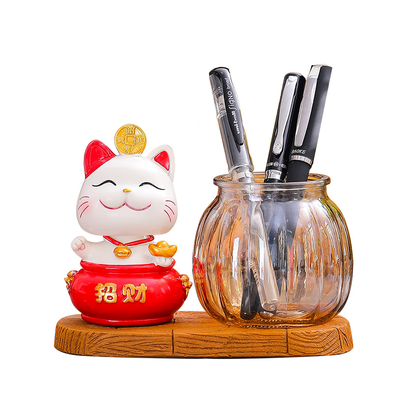 现货速发招财猫摆件店铺前台办公室桌面创意笔筒收纳摆设书房家居