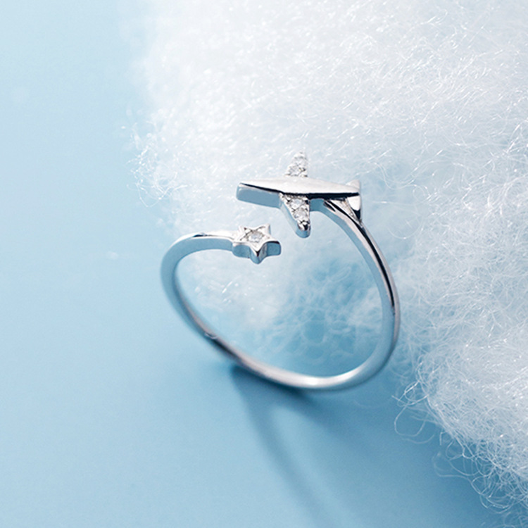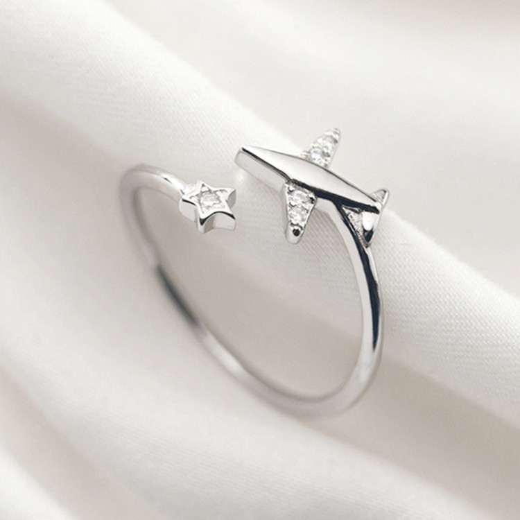 网红锆石飞机戒指女日韩风小清新个性五角星镶钻开口指环饰品