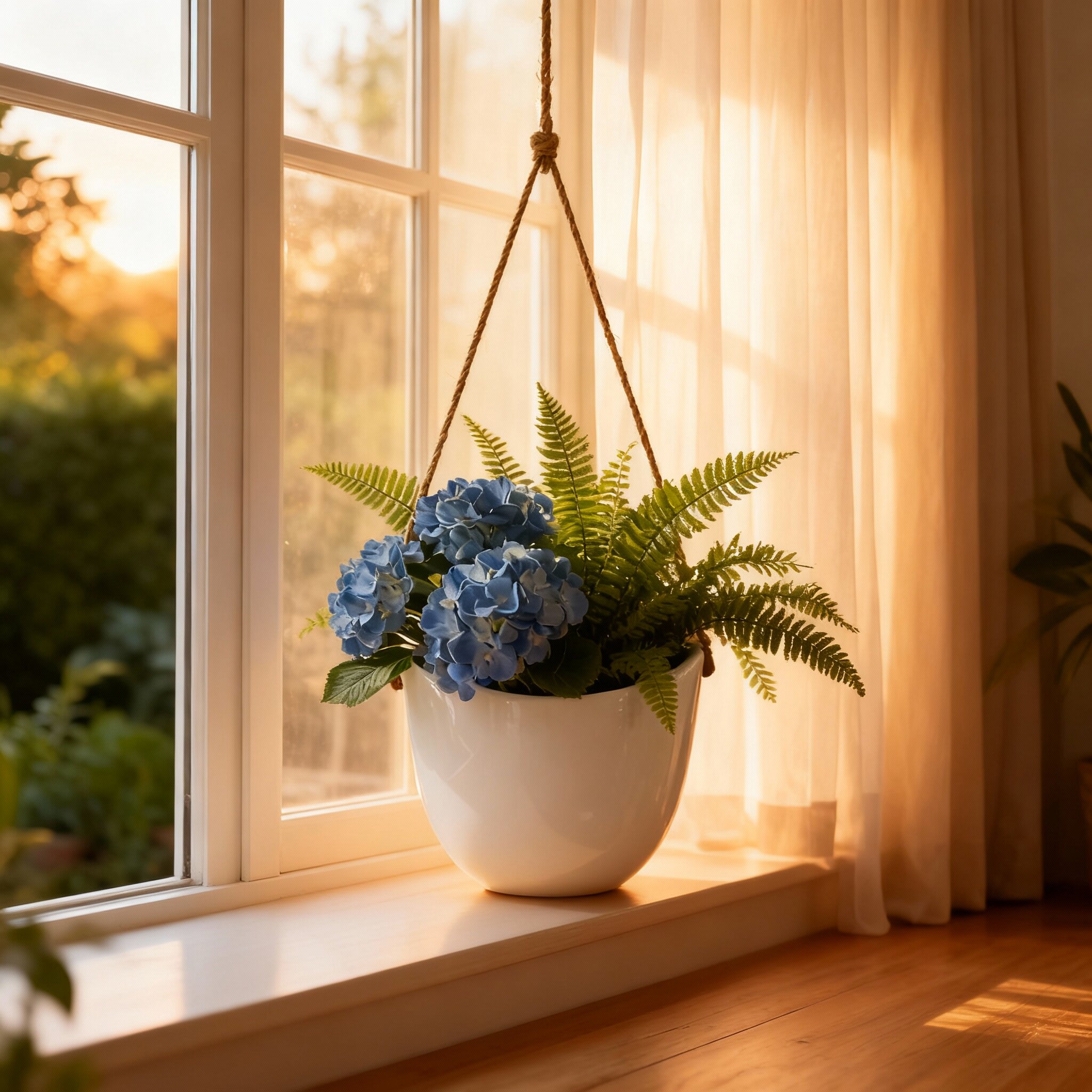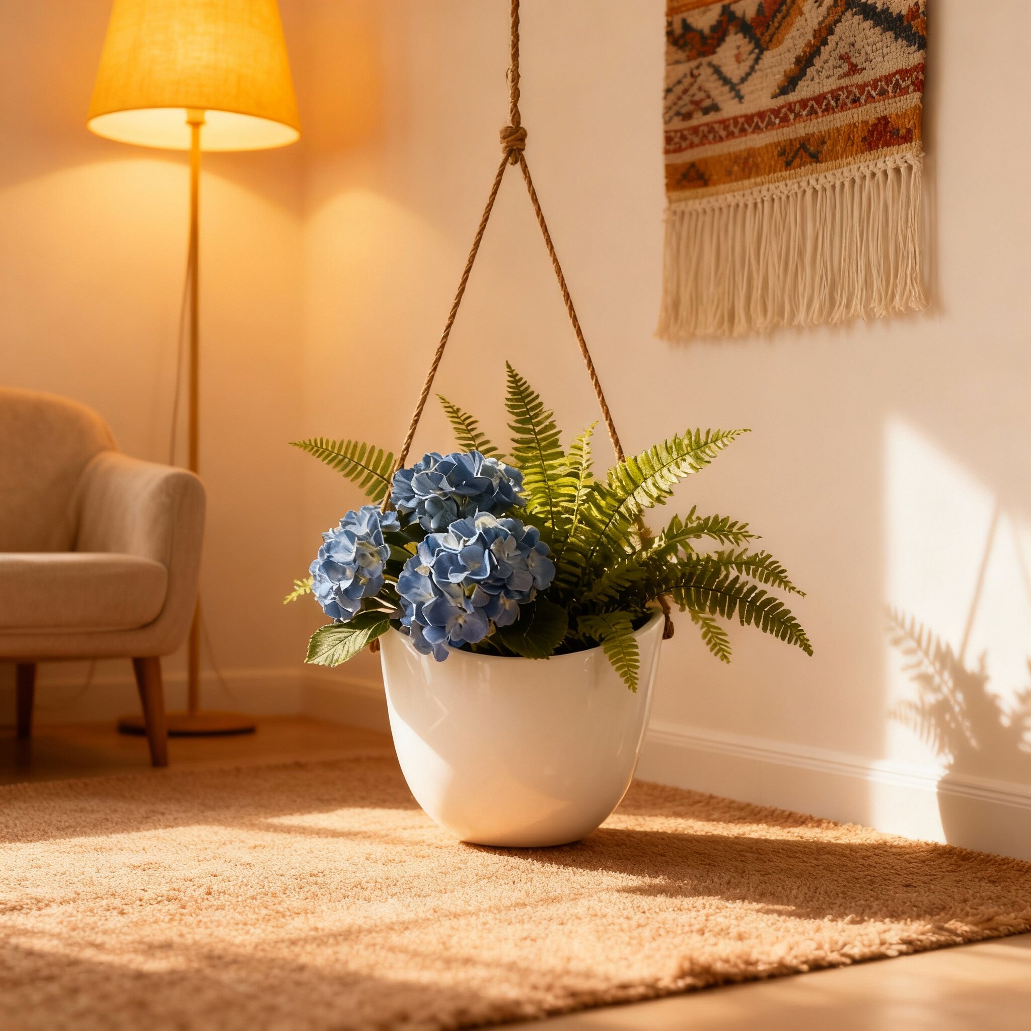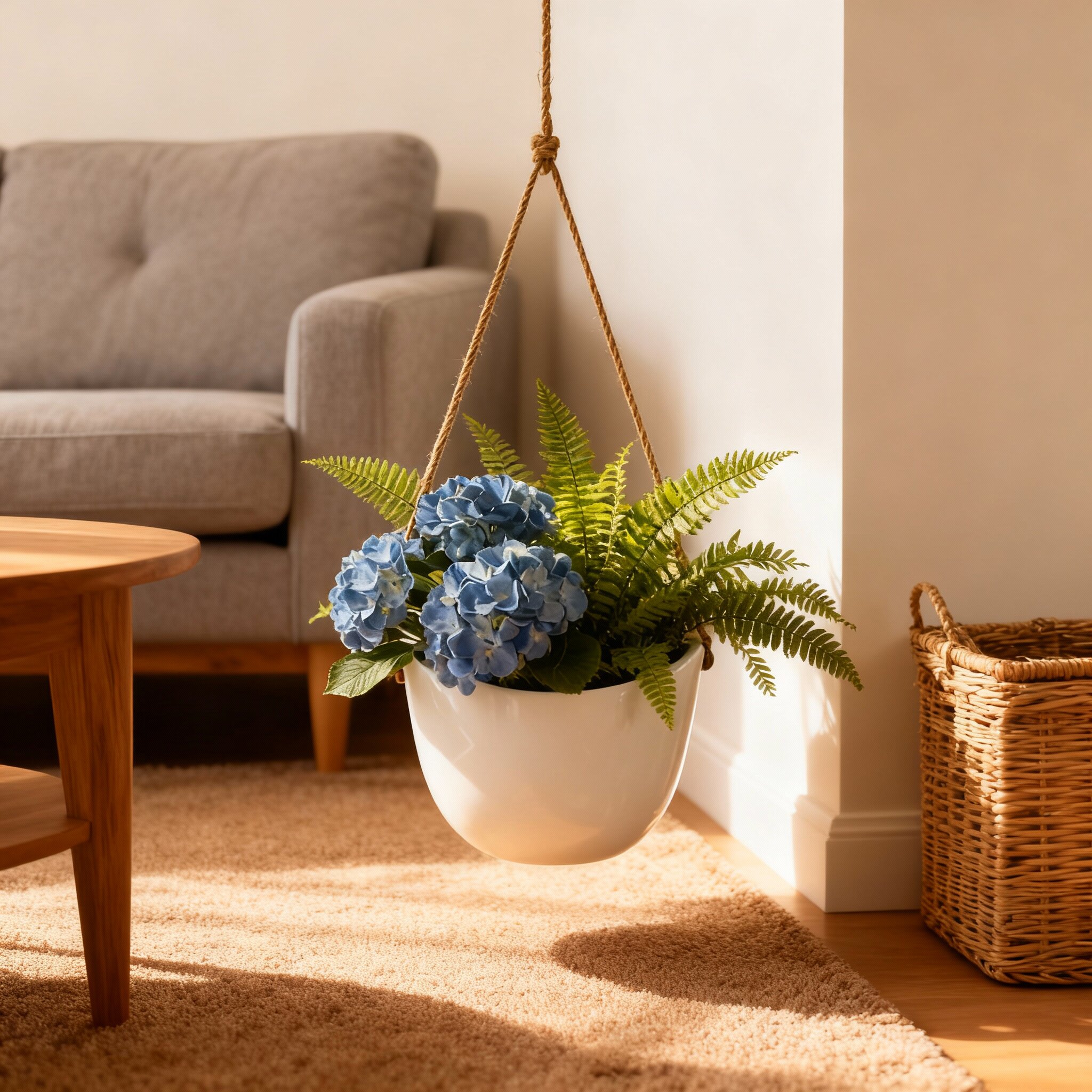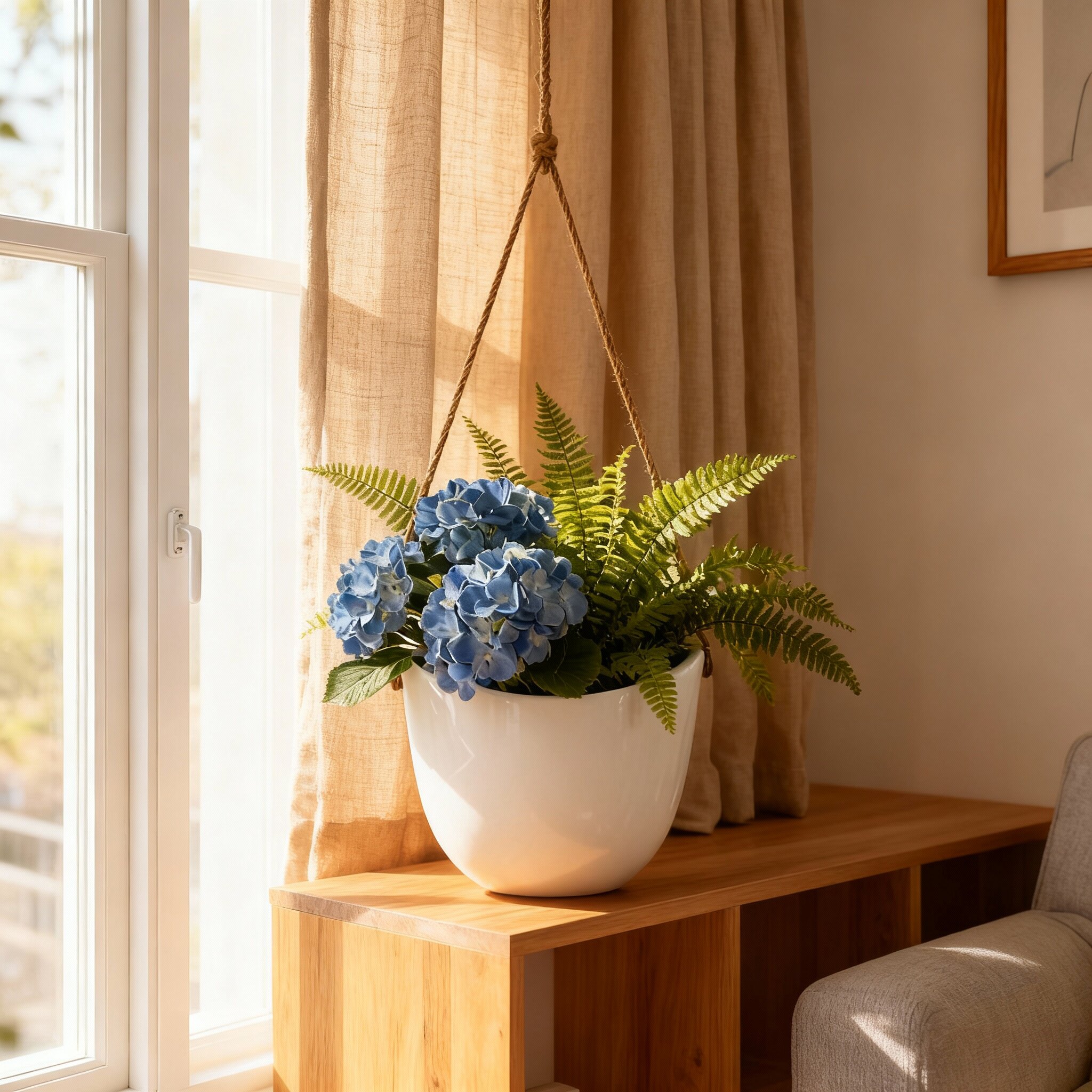 白色陶瓷花盆蓝色绣球绿植吊篮室内装饰摆件轻熟简约风