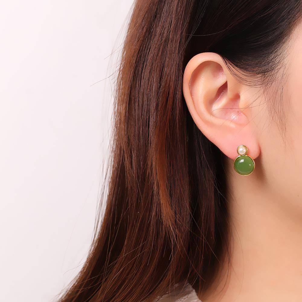 本命年925银镶镶嵌碧玉耳钉百搭时尚耳环精致简约高贵感爆礼物
