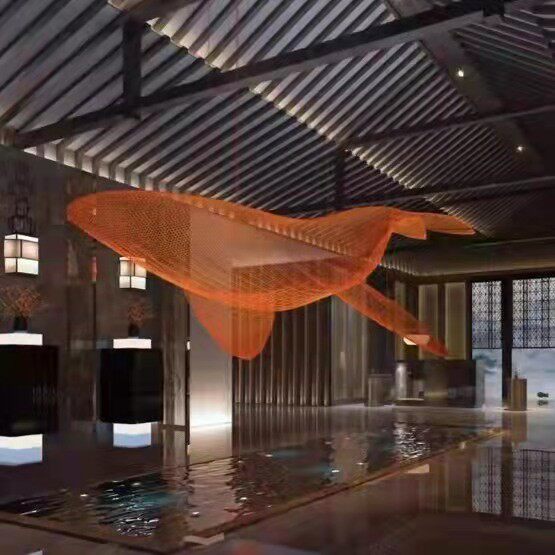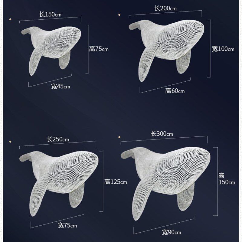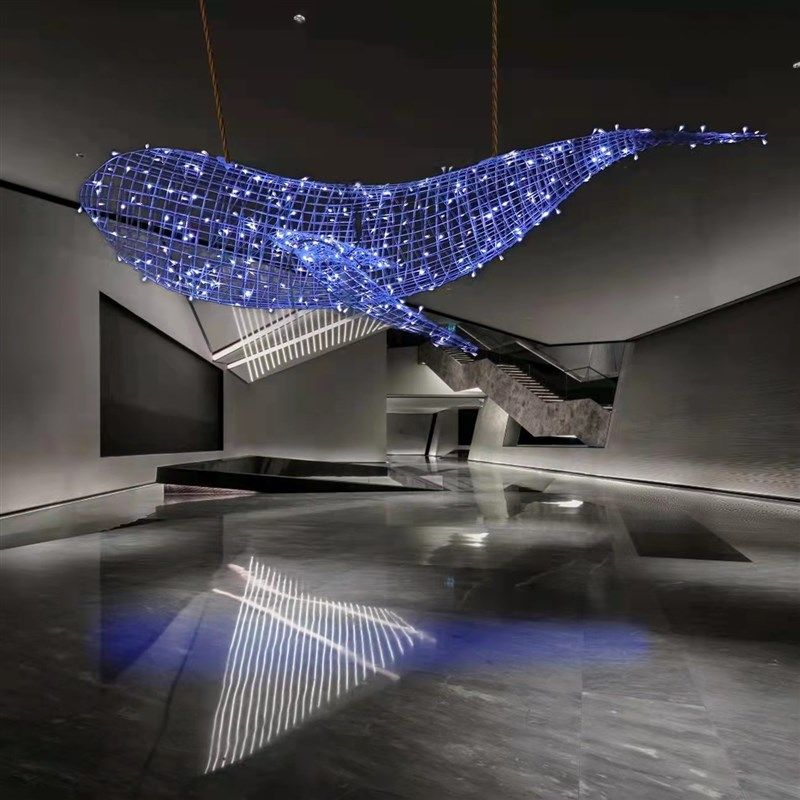 不锈钢铁艺镂空鲸鱼海豚网格编织酒店展厅海洋动物悬吊装饰品定制