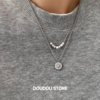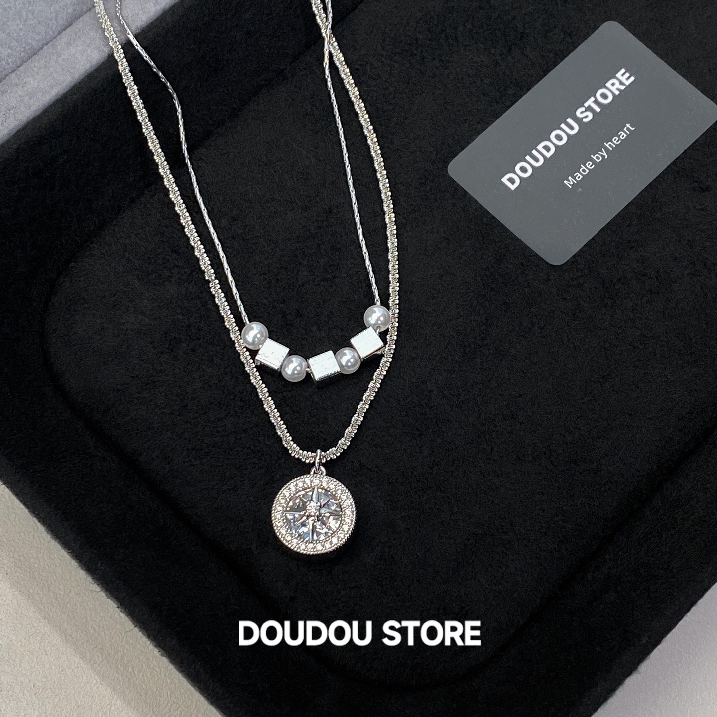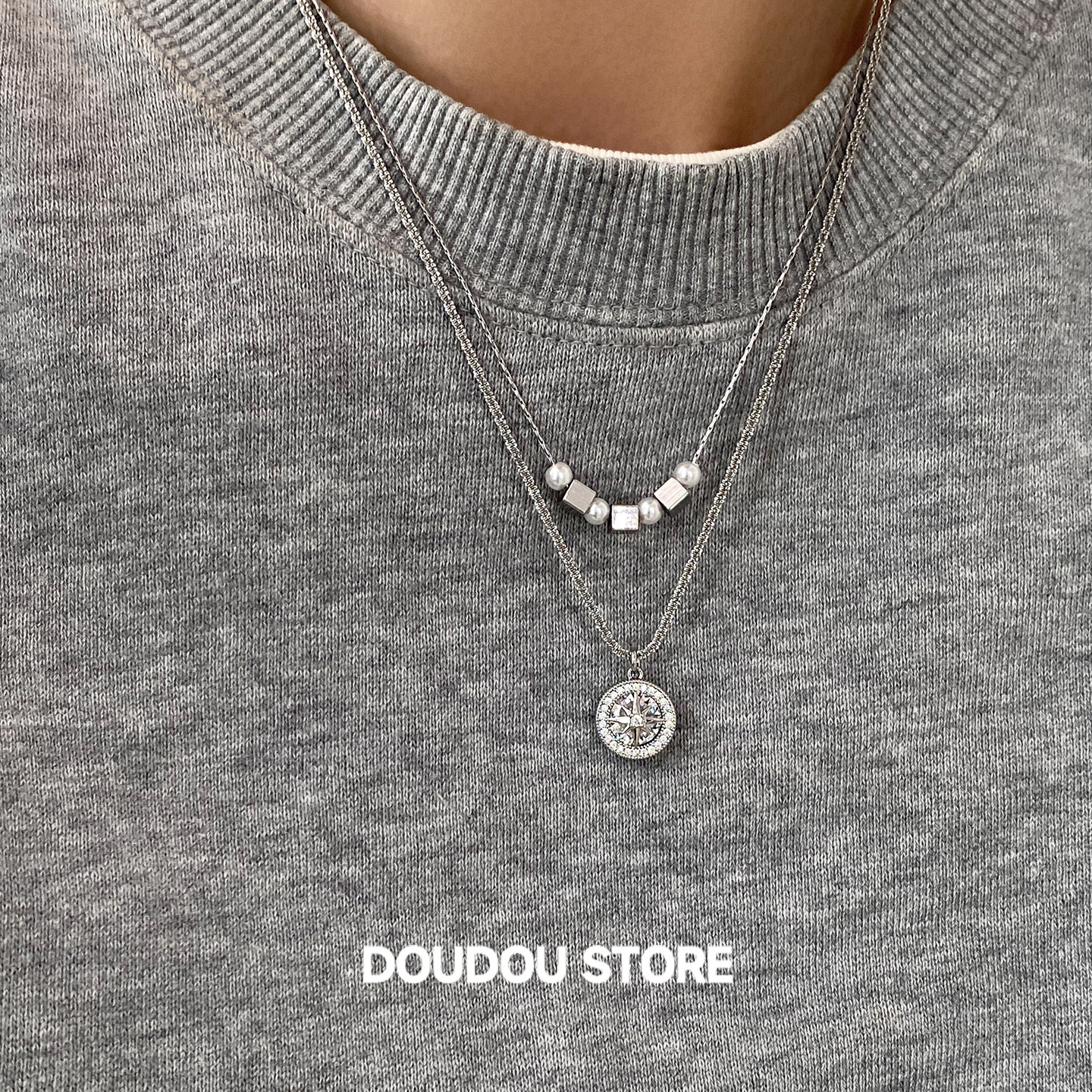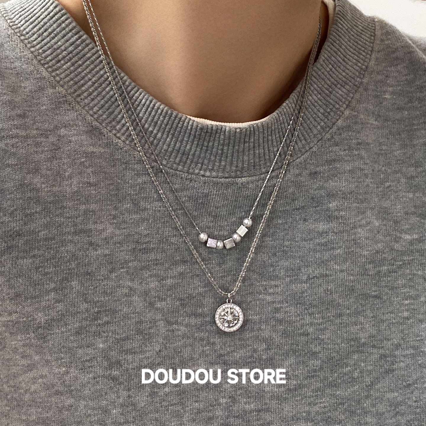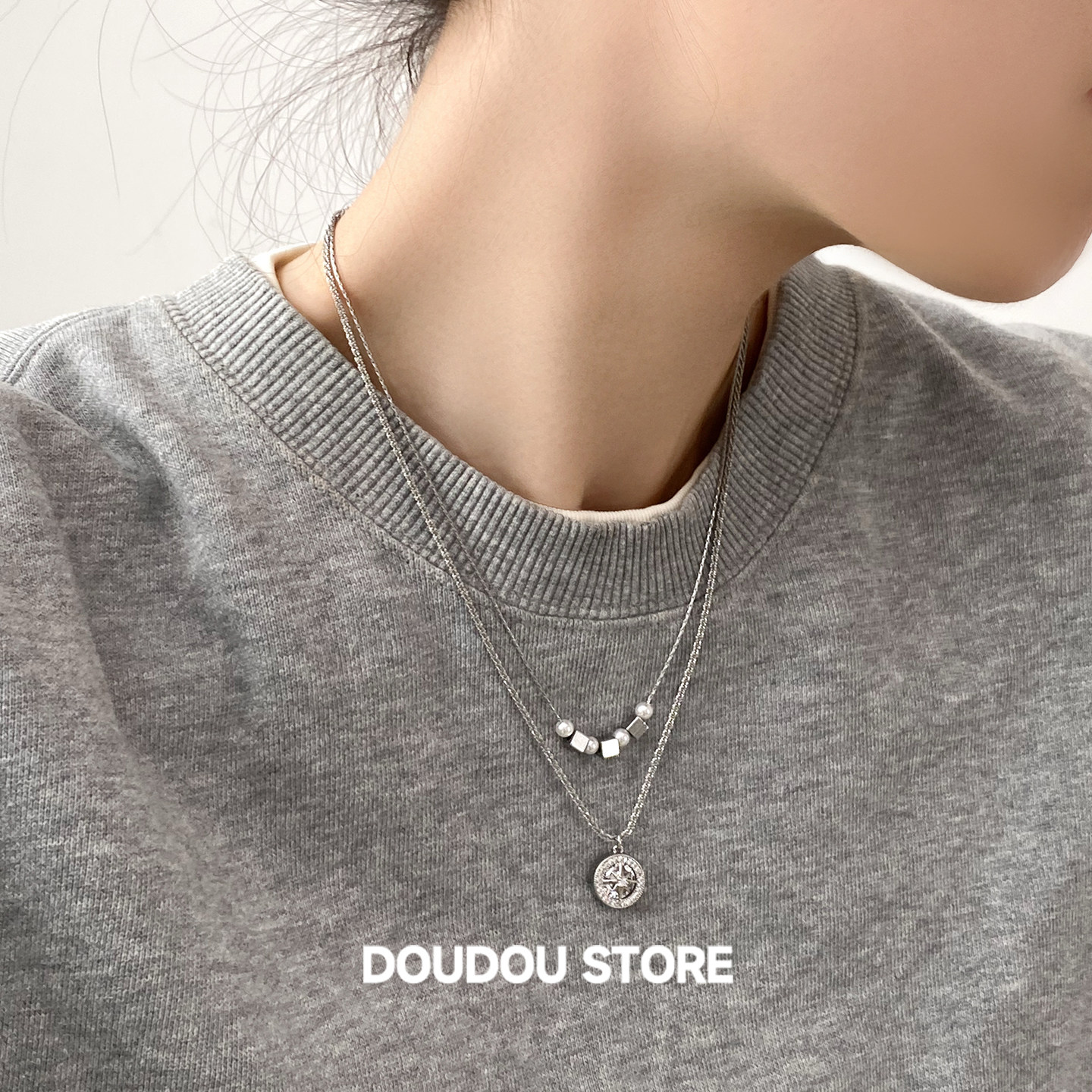 DOUDOUSTORE保色双层四芒星几何珍珠蛇骨链女简约银色项链百搭款