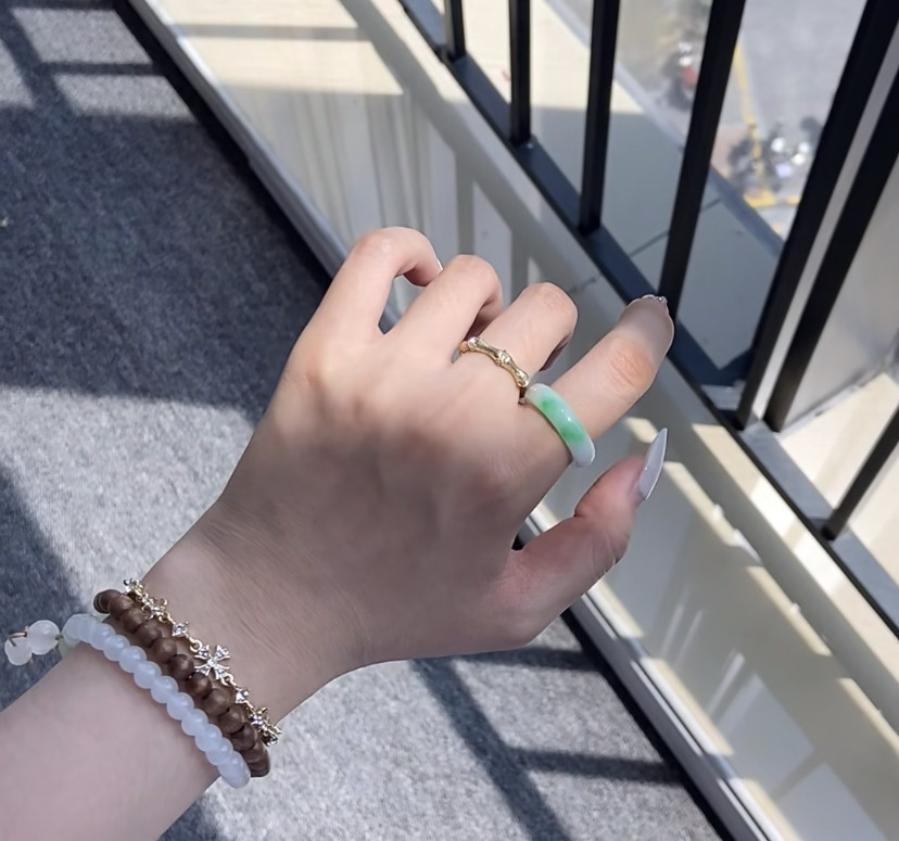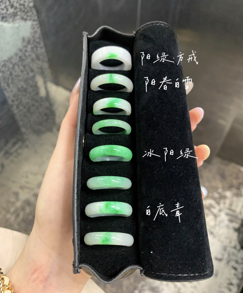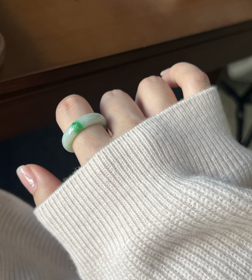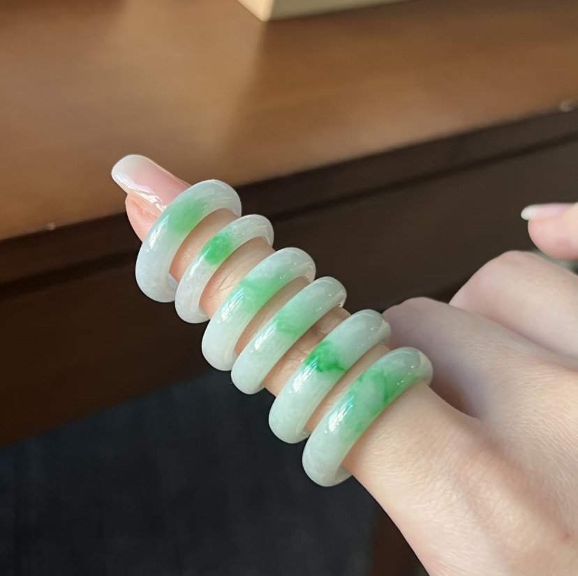 天然A货翡翠白底青飘阳绿戒指 冰糯种素圈玉戒圈男女款指环送礼