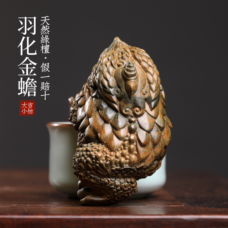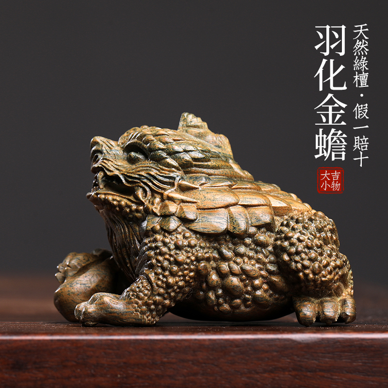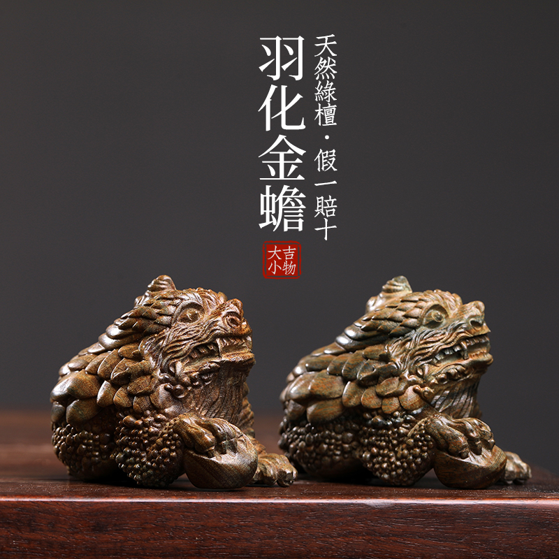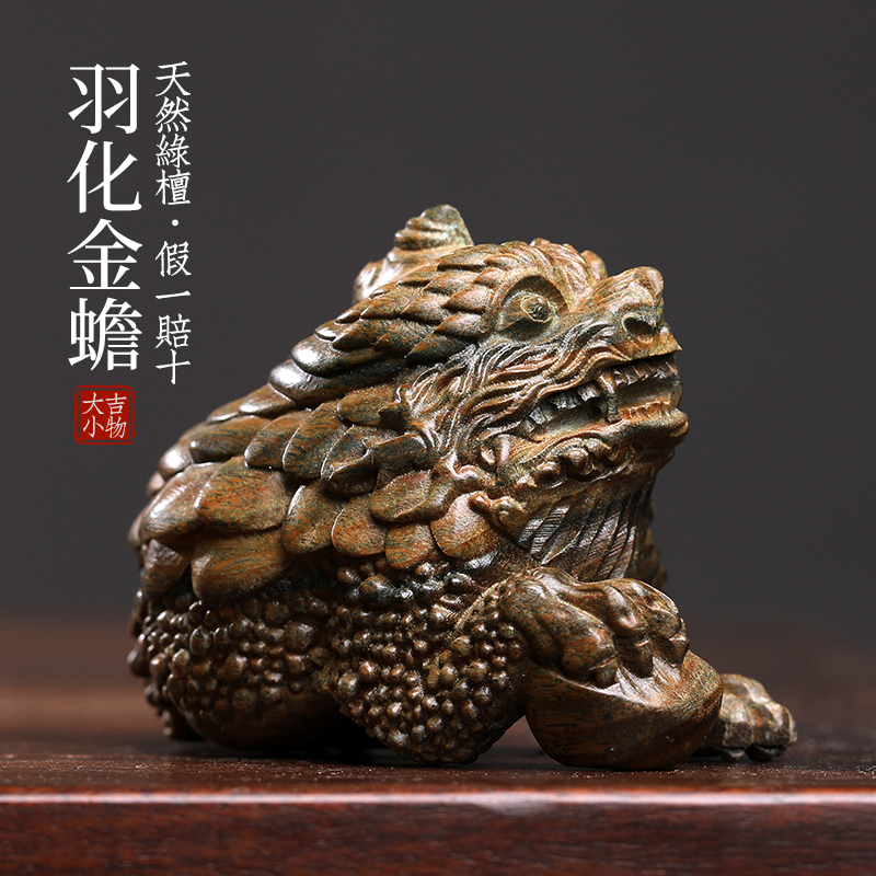 天然绿檀木雕刻羽化金蟾小摆件招财三足金蟾文玩手把件家居装饰品