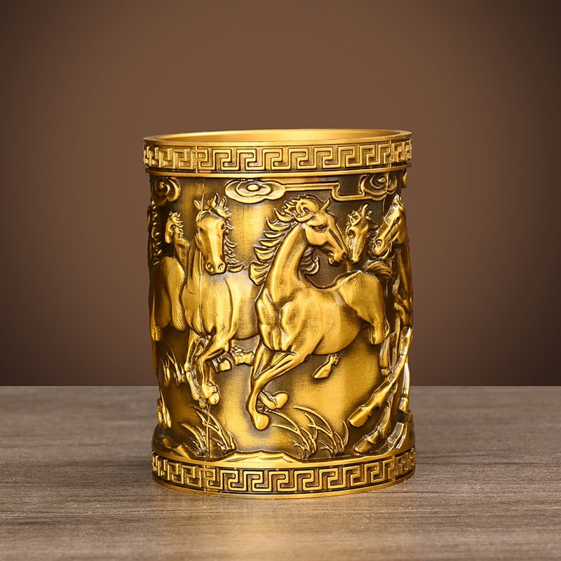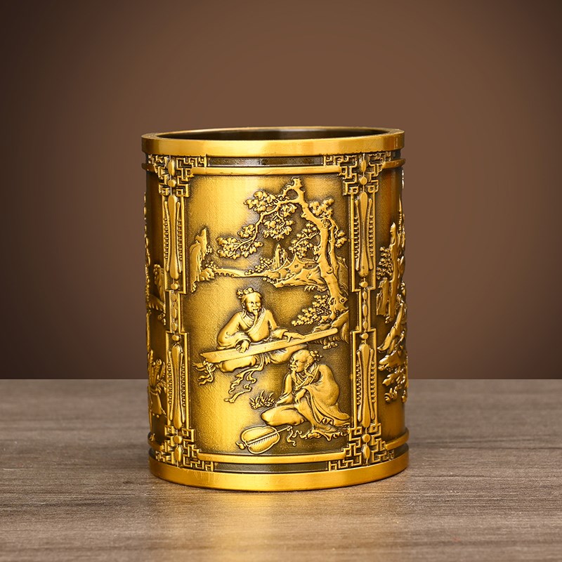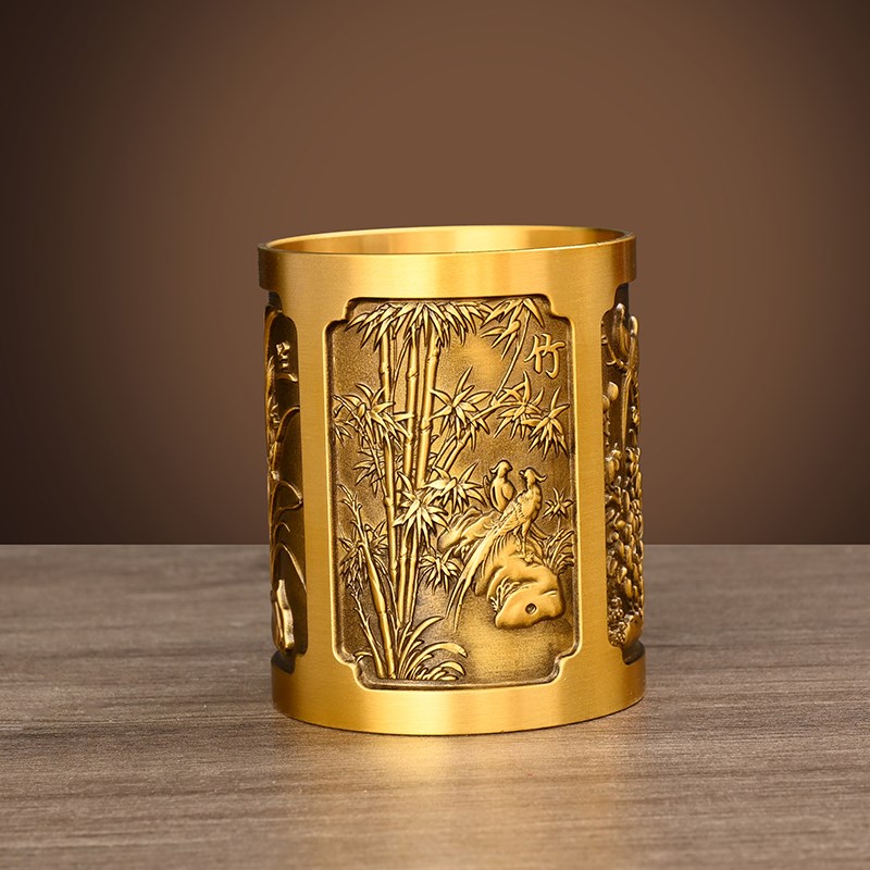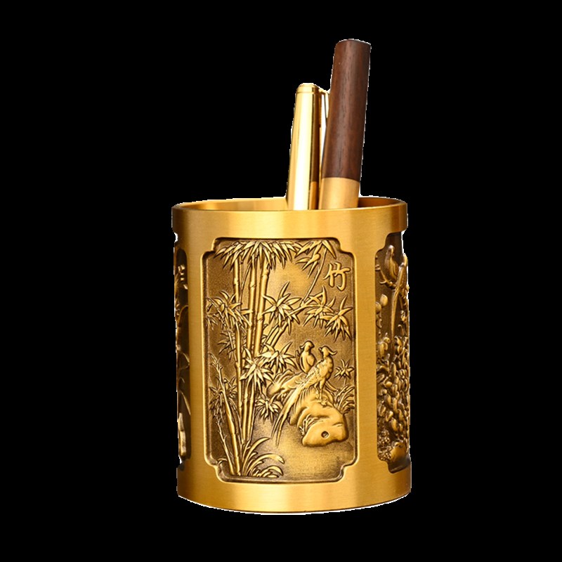 纯黄铜笔筒摆件实心铜笔筒中式办公桌书K桌面装饰品送老师同学礼