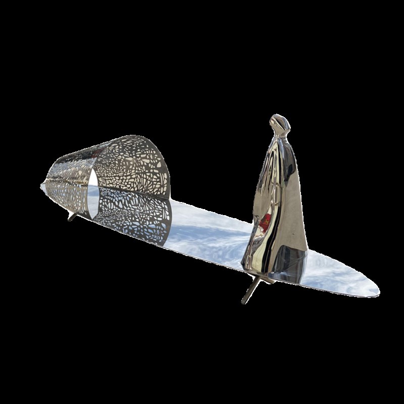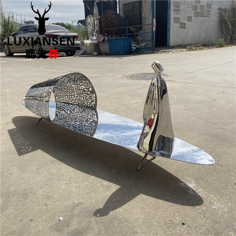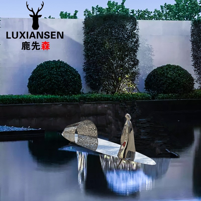 不锈钢镜面抽象小船雕塑金属户外水景水池渔人与船纯手工装饰摆件