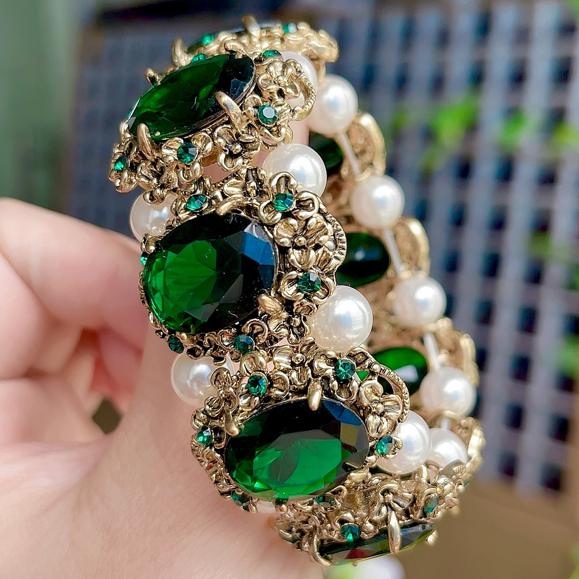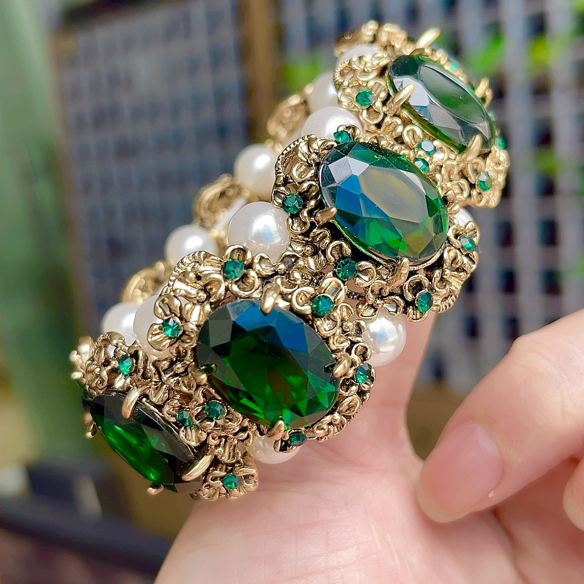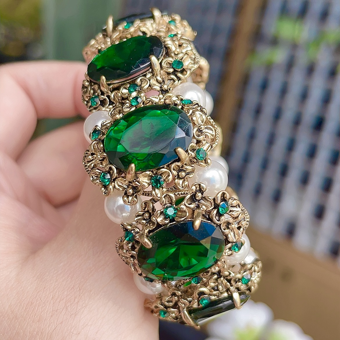 欧美时尚复古个性款祖母绿色水晶宝石珍珠手链手镯日韩潮流行配饰
