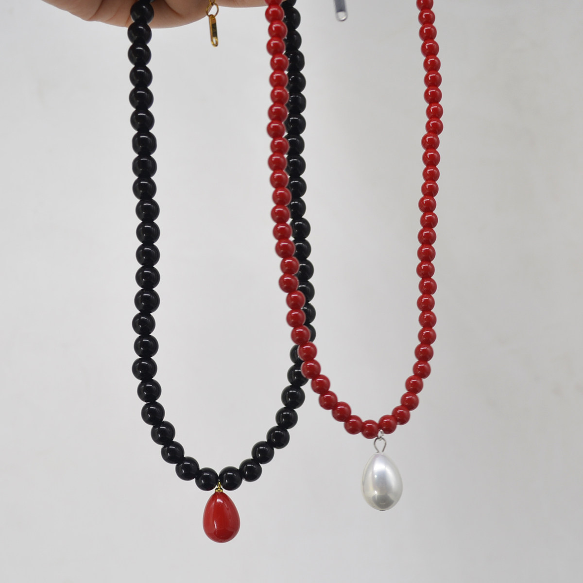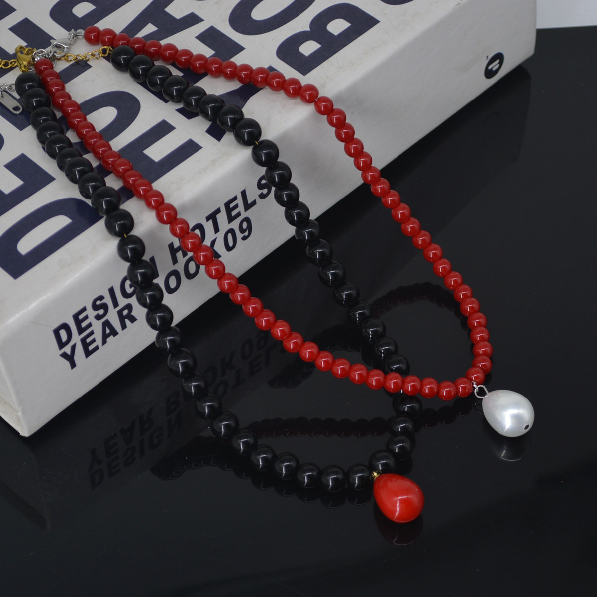 复古小众红色水滴黑玛瑙珍珠串珠项链女日韩博主手工短款锁骨链