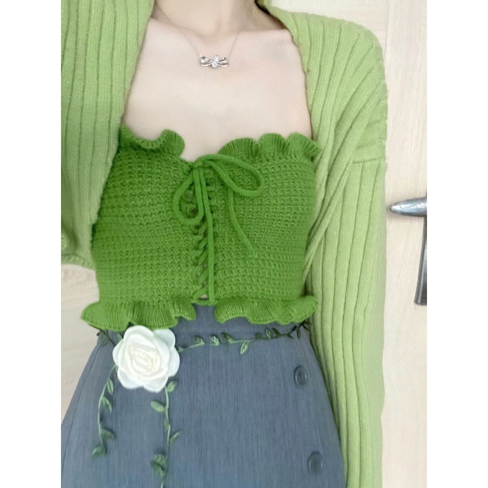 进口春季时尚减龄套装女2023新款胖mm温柔系开衫背心半身裙气质