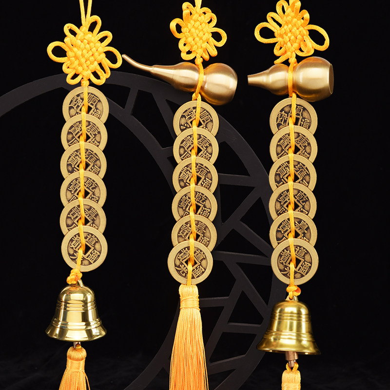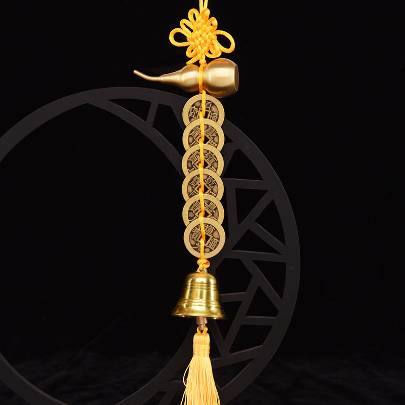 2023年化五黄二黑黄色绳六帝钱铜葫芦铜铃铛门对门五帝钱吉祥挂件