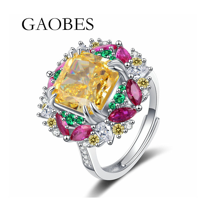 海瑞糖果系列冰花切S925通体纯银开口戒指女金黄色高碳钻时尚钻戒