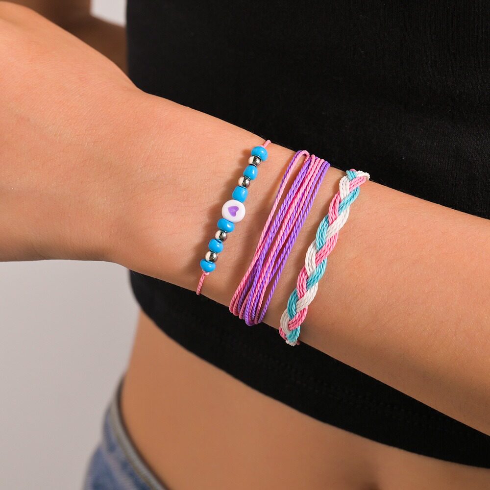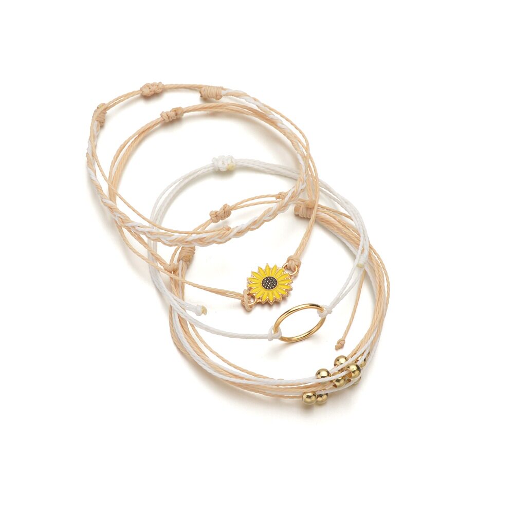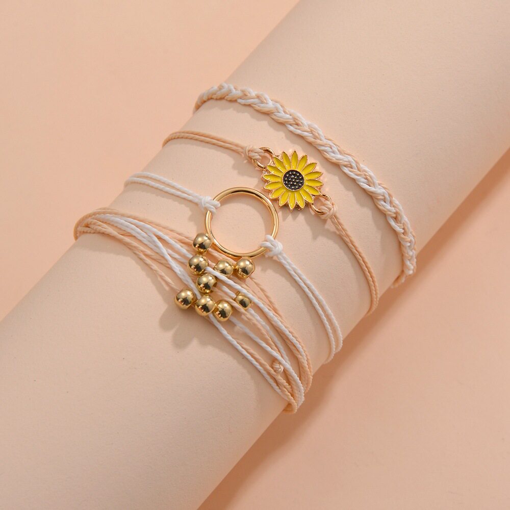 波西米亚度假风合金向日葵圆环金珠编织手链4件套女通用
