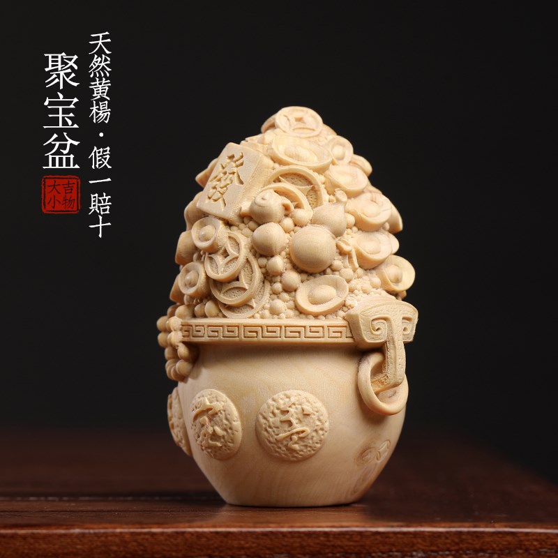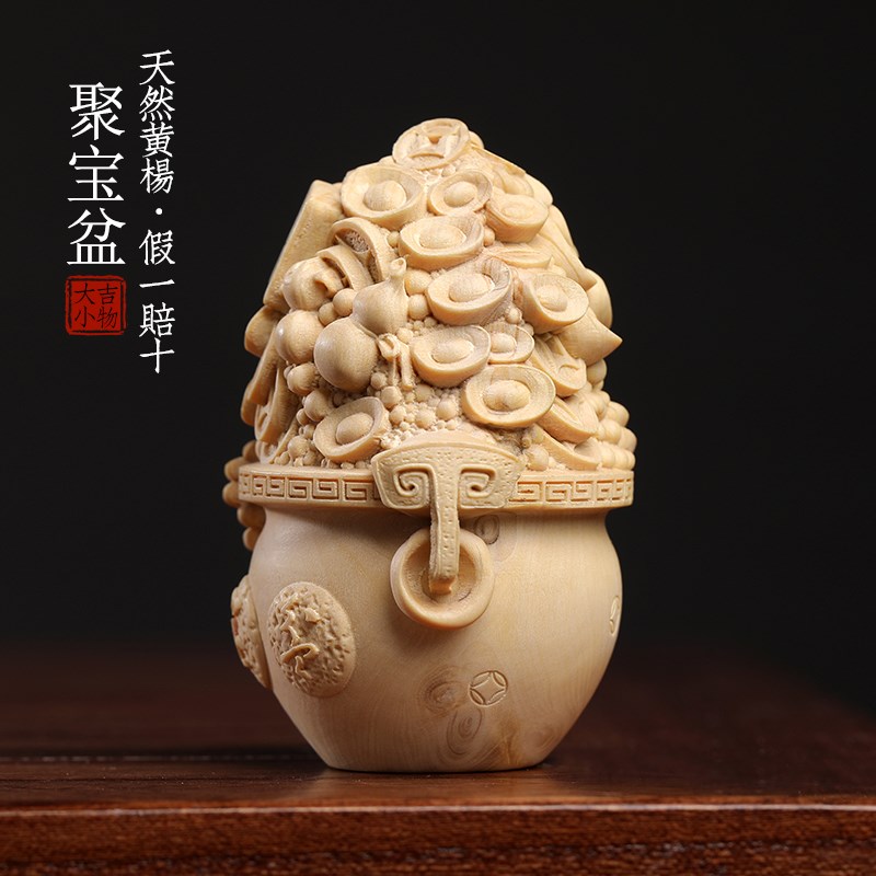 天然小叶黄杨木雕刻聚宝盆手把件招财元宝葫芦如意好运桌面小摆件