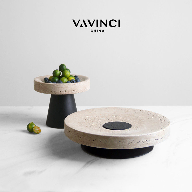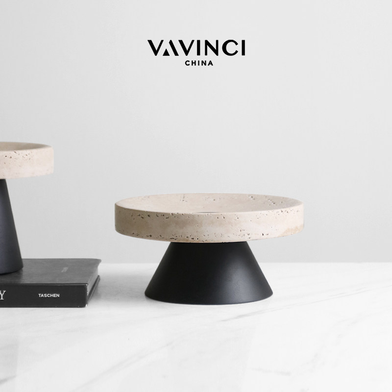 梵其侘寂风创意洞石圆形实木底托盘摆件简约N客厅茶几餐桌果盘装
