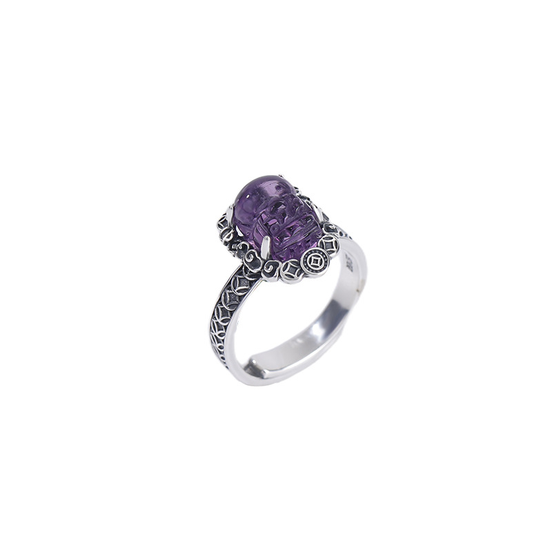 悦宝珠宝紫水晶S990足银做旧复古貔貅铜钱钱币中式国风银戒指现货