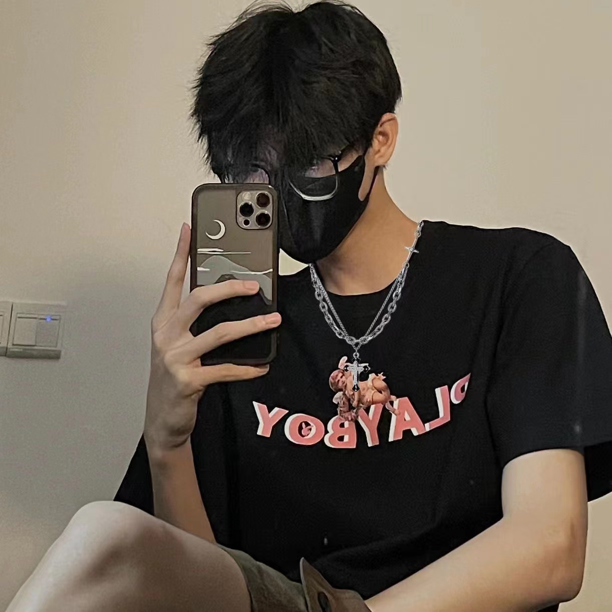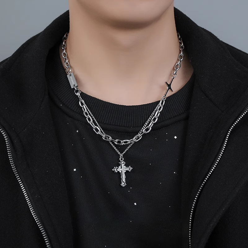 冷淡风双层十字架项链男生小众设计高级感嘻哈钛钢吊坠高街毛衣链