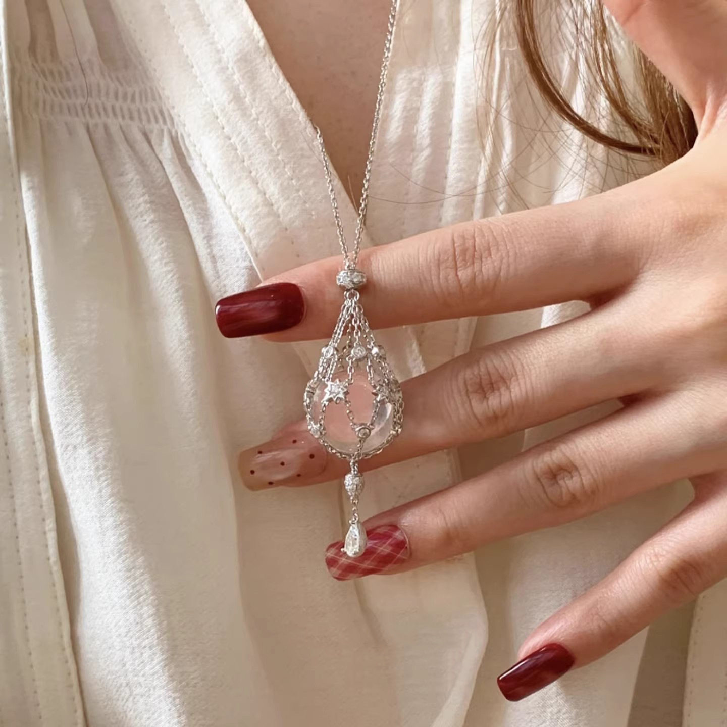 Young小红书爆款白水晶星芒网兜吊坠伸缩项链配饰小众设计百搭女