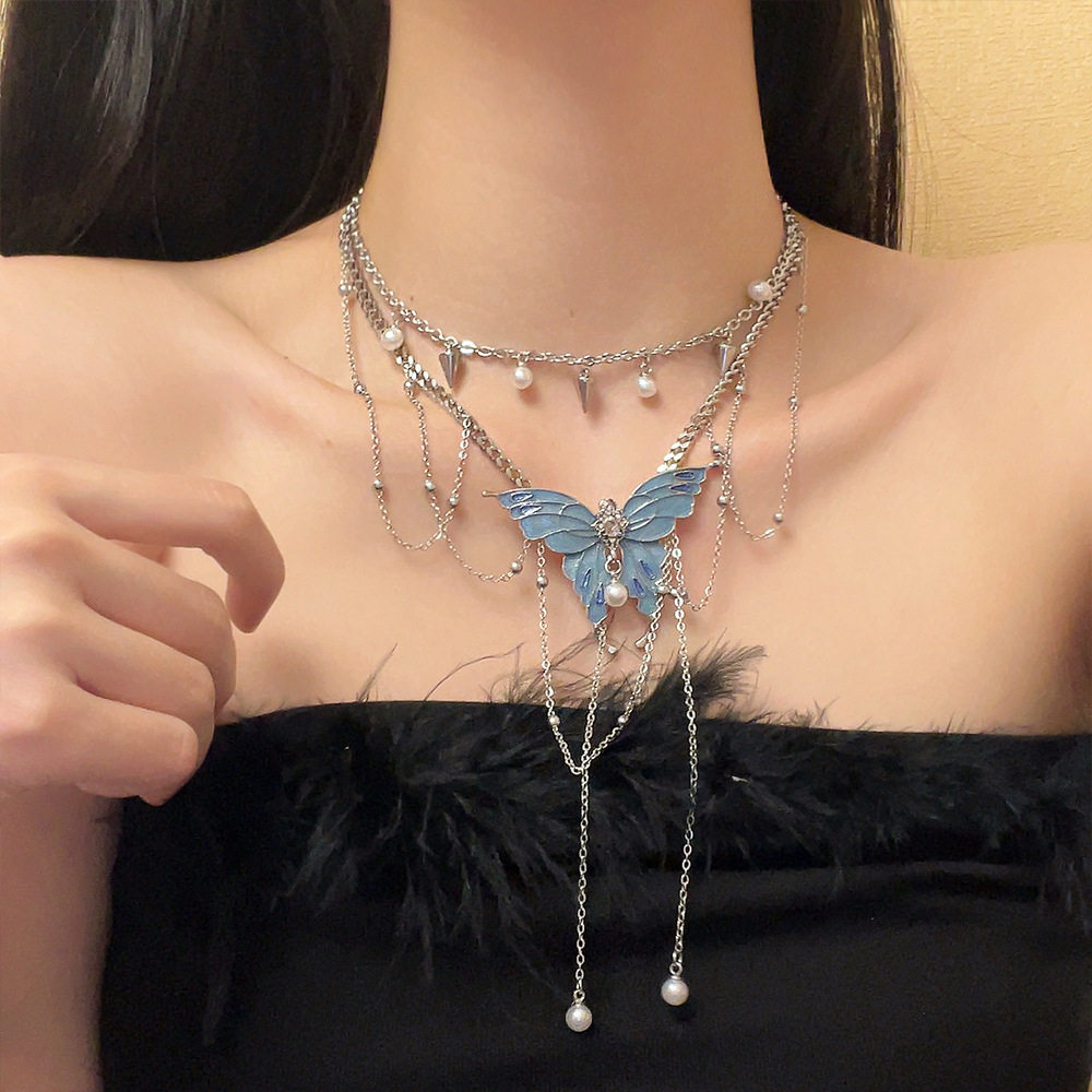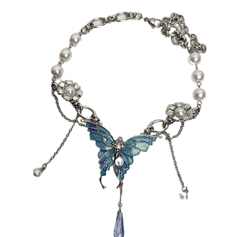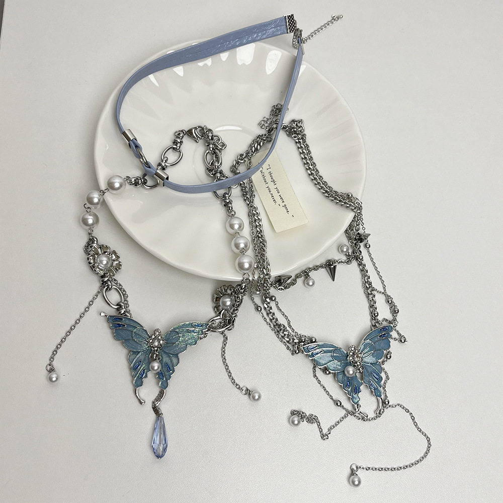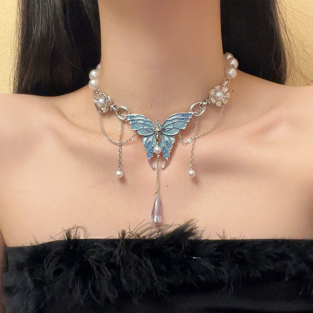 超仙串珠蓝色蝴蝶吊坠项链项圈女小众甜美气质轻奢百搭锁骨
