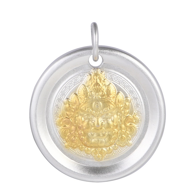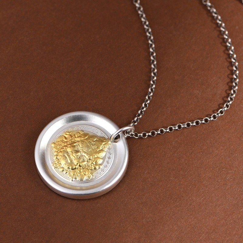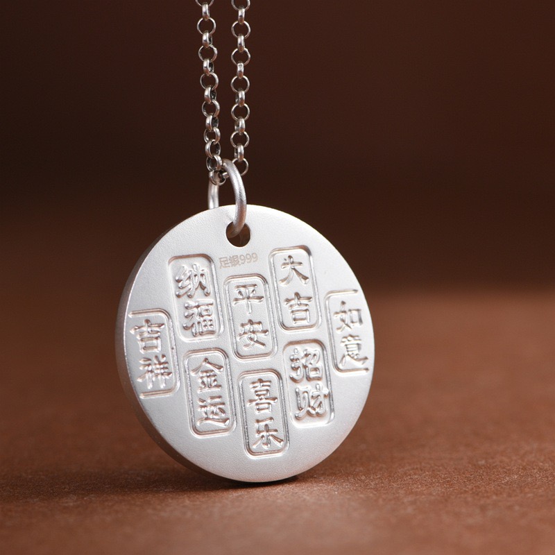民族风足银999吊坠描金黄财像如意平安吉言圆牌毛衣链项坠银饼坠