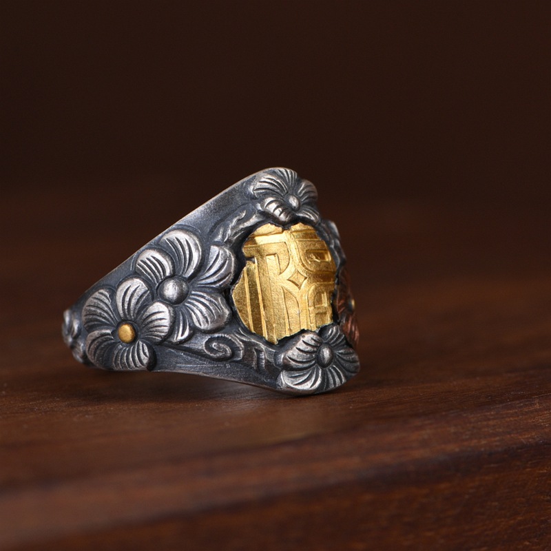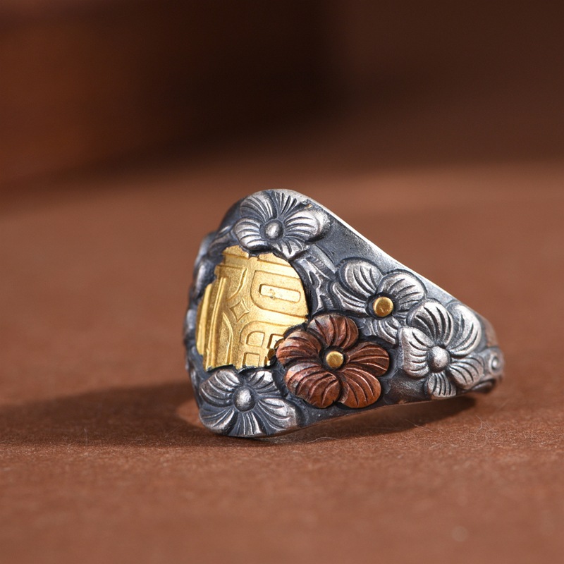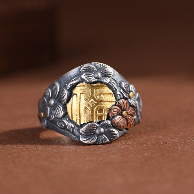 足银戒指手工金银错鎏金复古小众设计中式民族风开口福字纯银指环