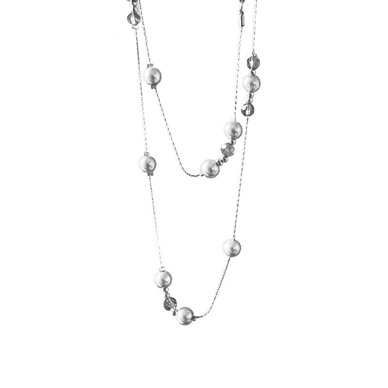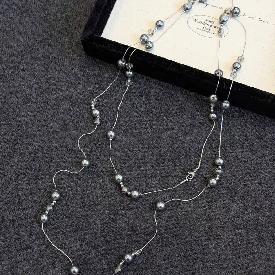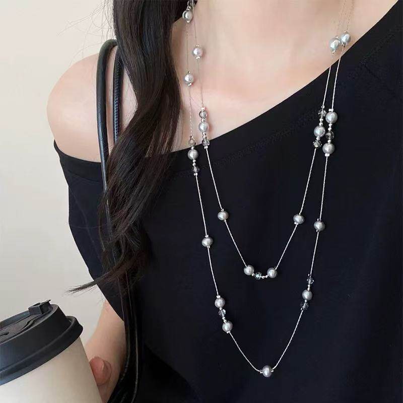 轻奢多层灰色玻璃珍珠女士项链叠戴百搭长款毛衣链秋冬服装配饰品