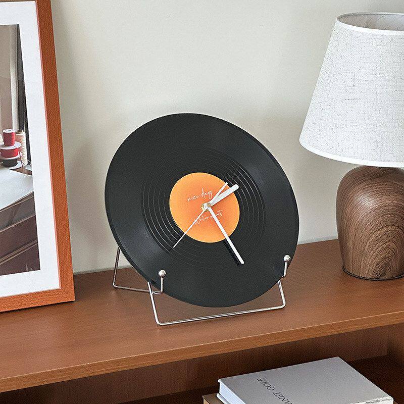 复古黑胶唱片钟日落挂钟客厅办公室书桌桌面摆件酒柜电视墙面装饰