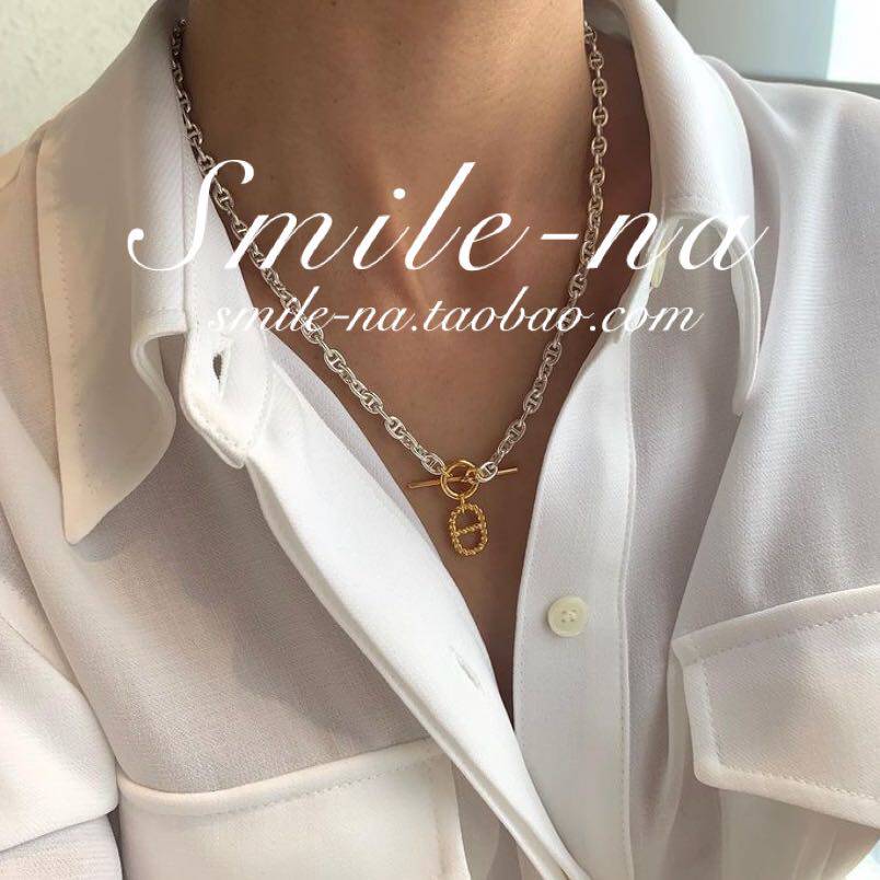 韩国进口925纯银设计师款猪鼻子OT扣项链金色吊坠锁骨短款项链