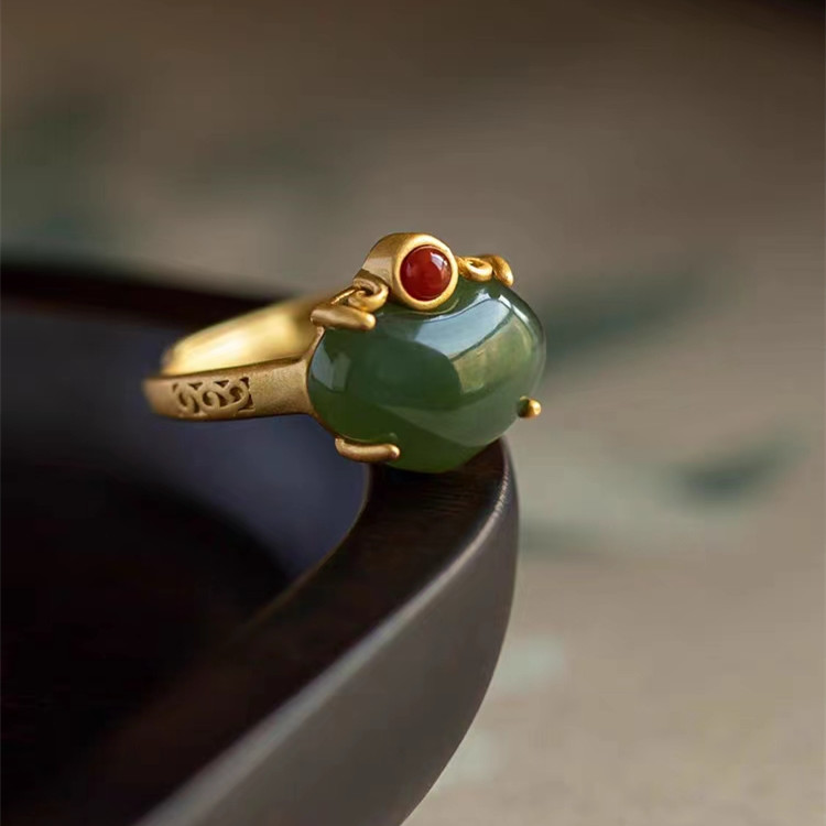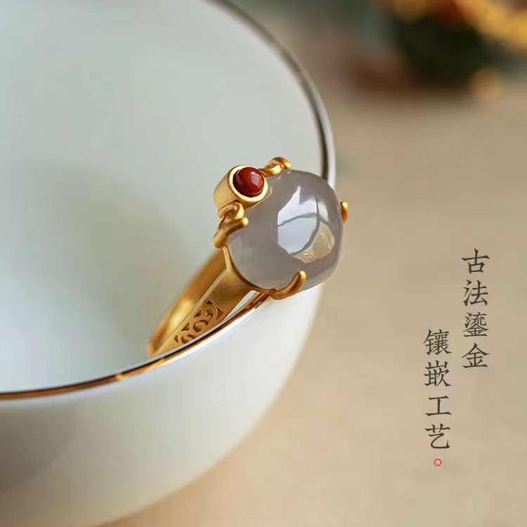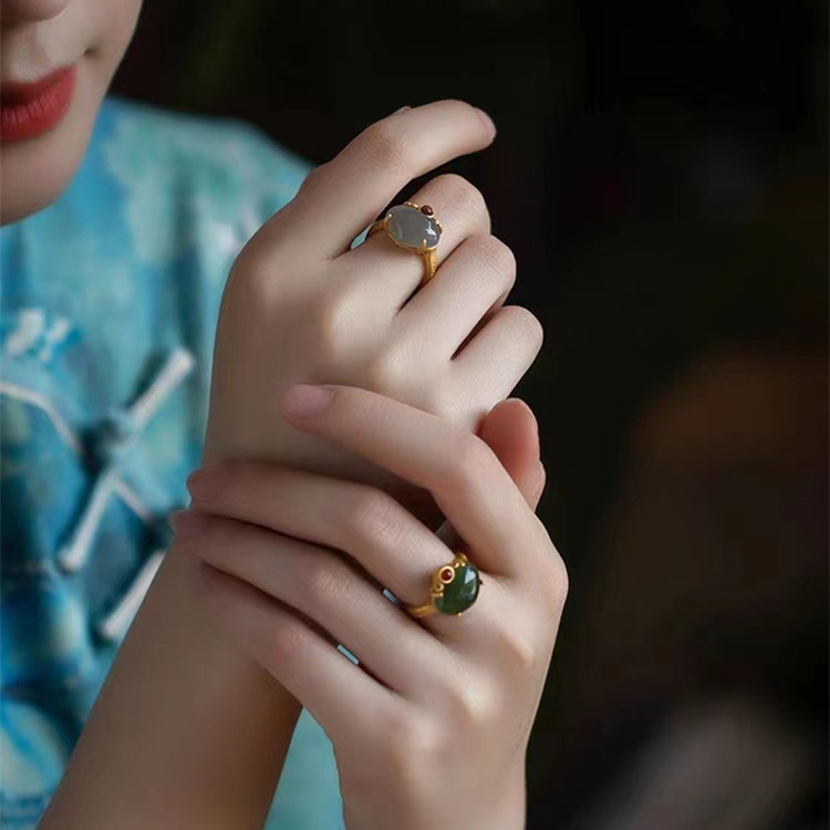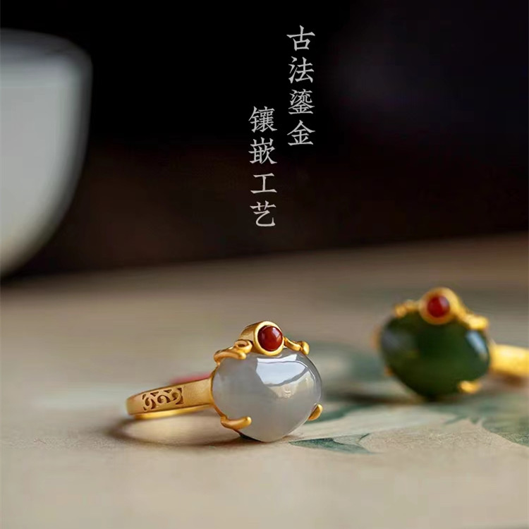 顺心如意镀金戒指女可调节仿和田玉玉石精致复古民族风宫廷食指戒