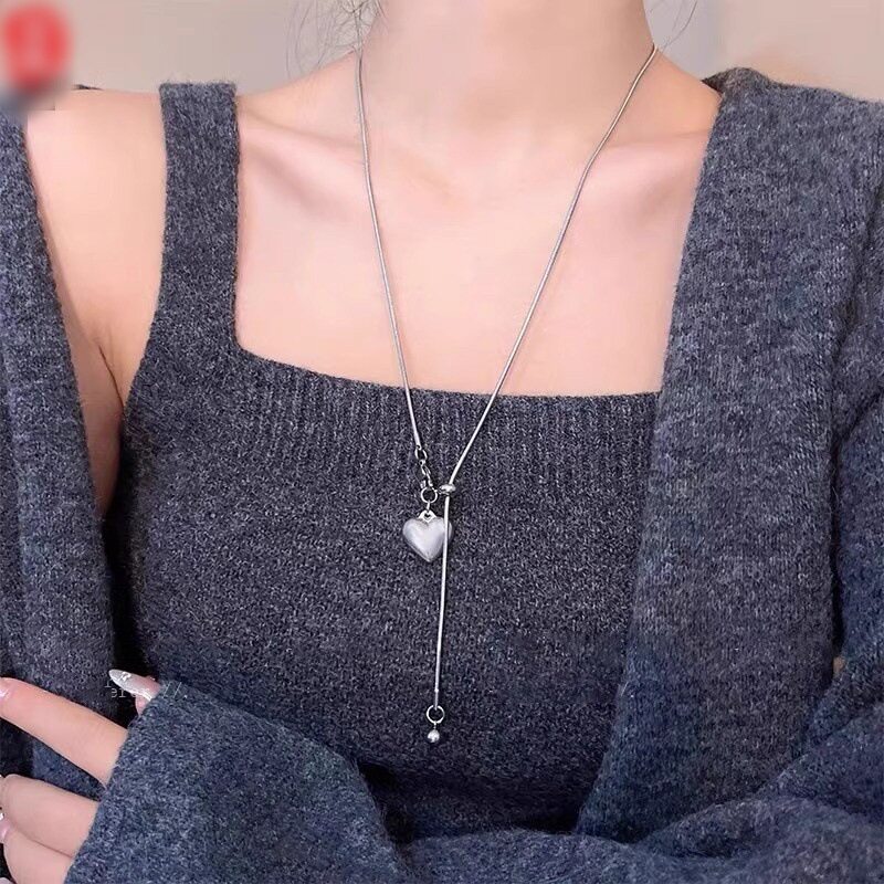 极简银色爱心吊坠项链女款秋冬韩系小众设计配饰长款抽拉式毛衣链