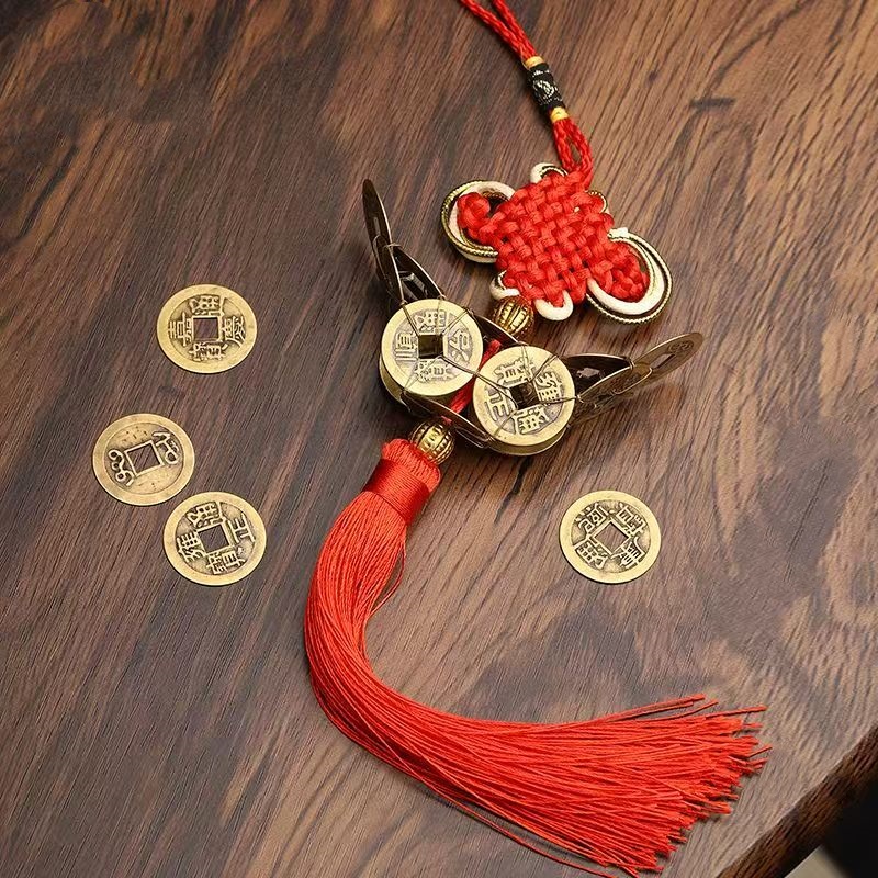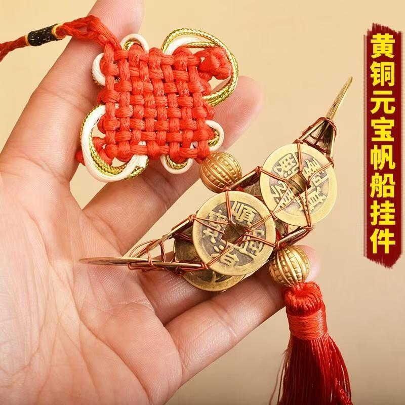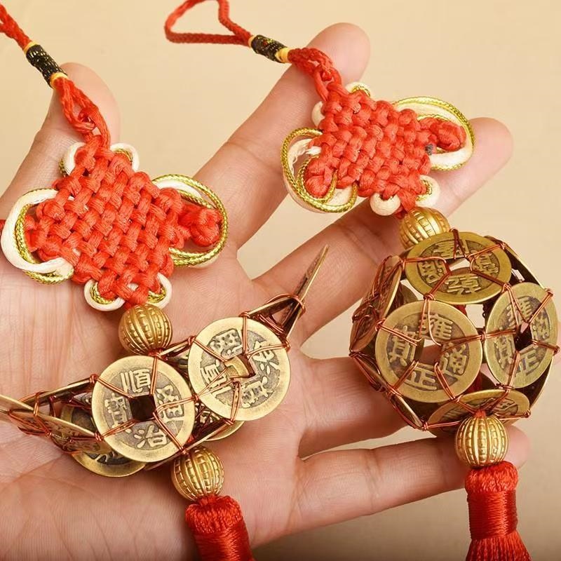 黄铜手工编织铜钱元宝挂路路通挂件红中国结五帝钱玄关入户门摆件