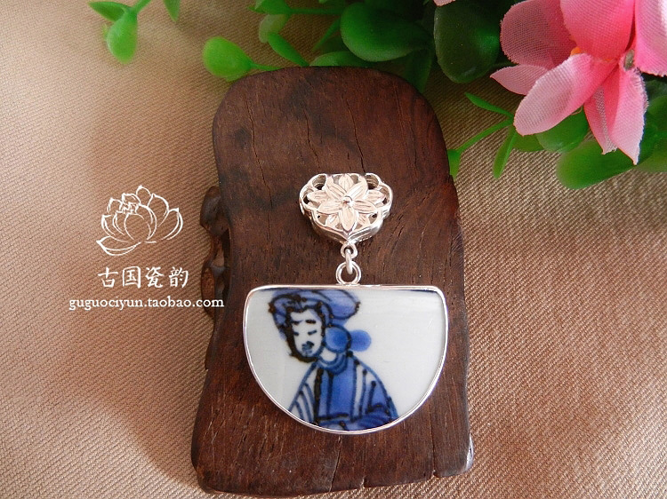 手工925纯银镶嵌 古老瓷片首饰品 明 青花仕女图 吊坠项坠 有弧度