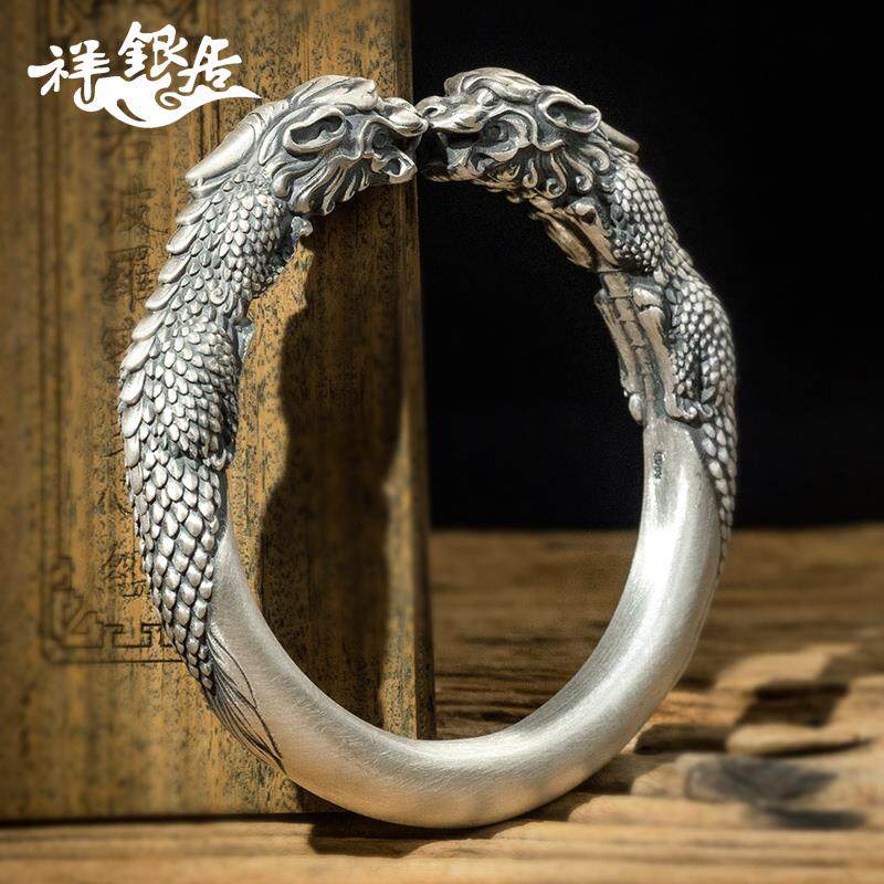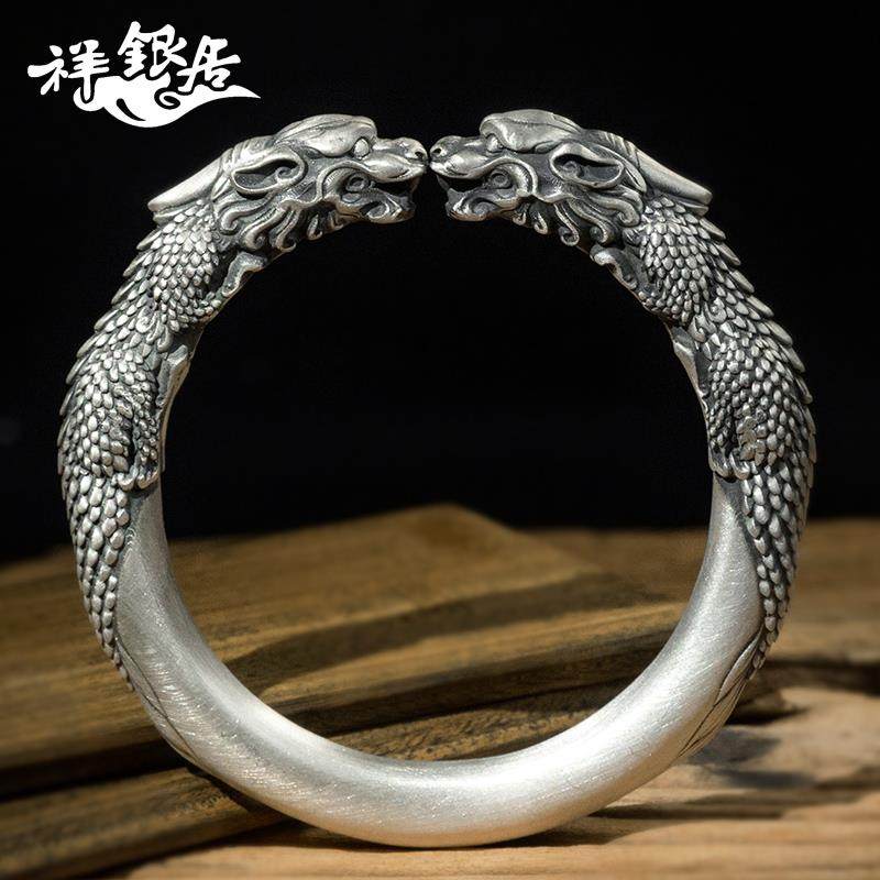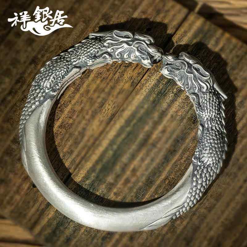 高档貔貅开手镯男士云南雪花银 口银实心原创设计手工精双雕手镯.