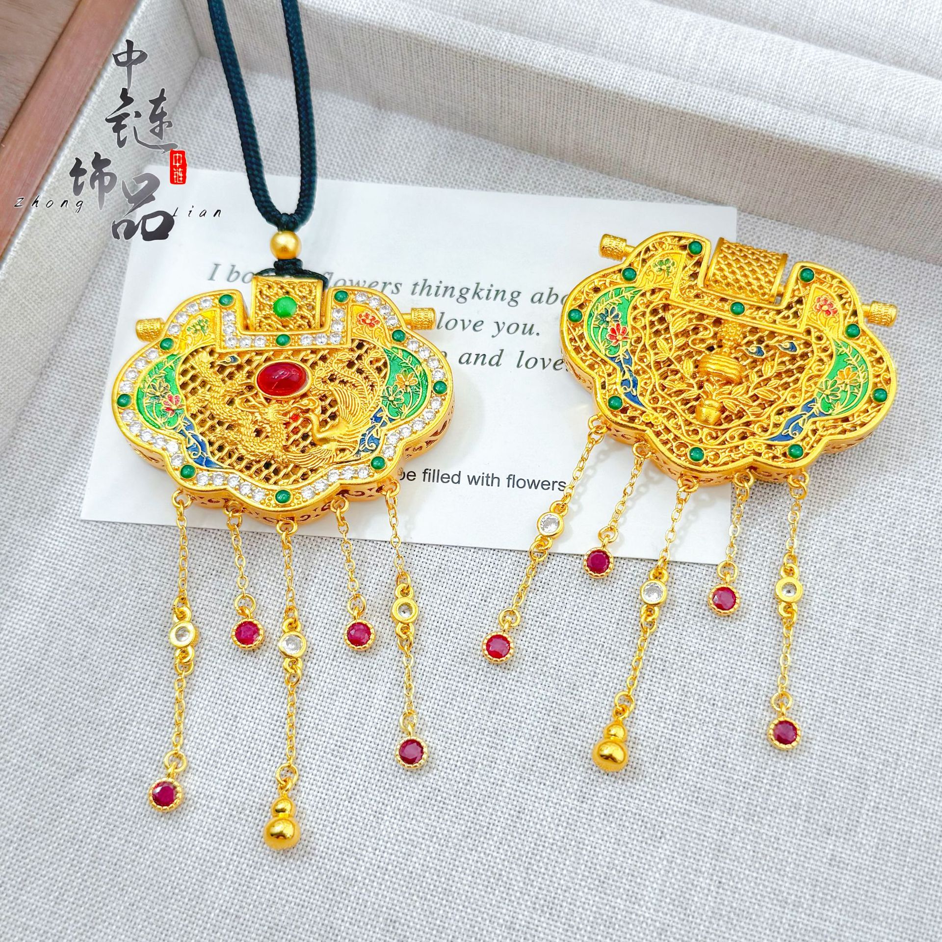 金店同款古法沙金珐琅彩镶钻天子门生龙凤锁包吊坠新中式流苏锁包
