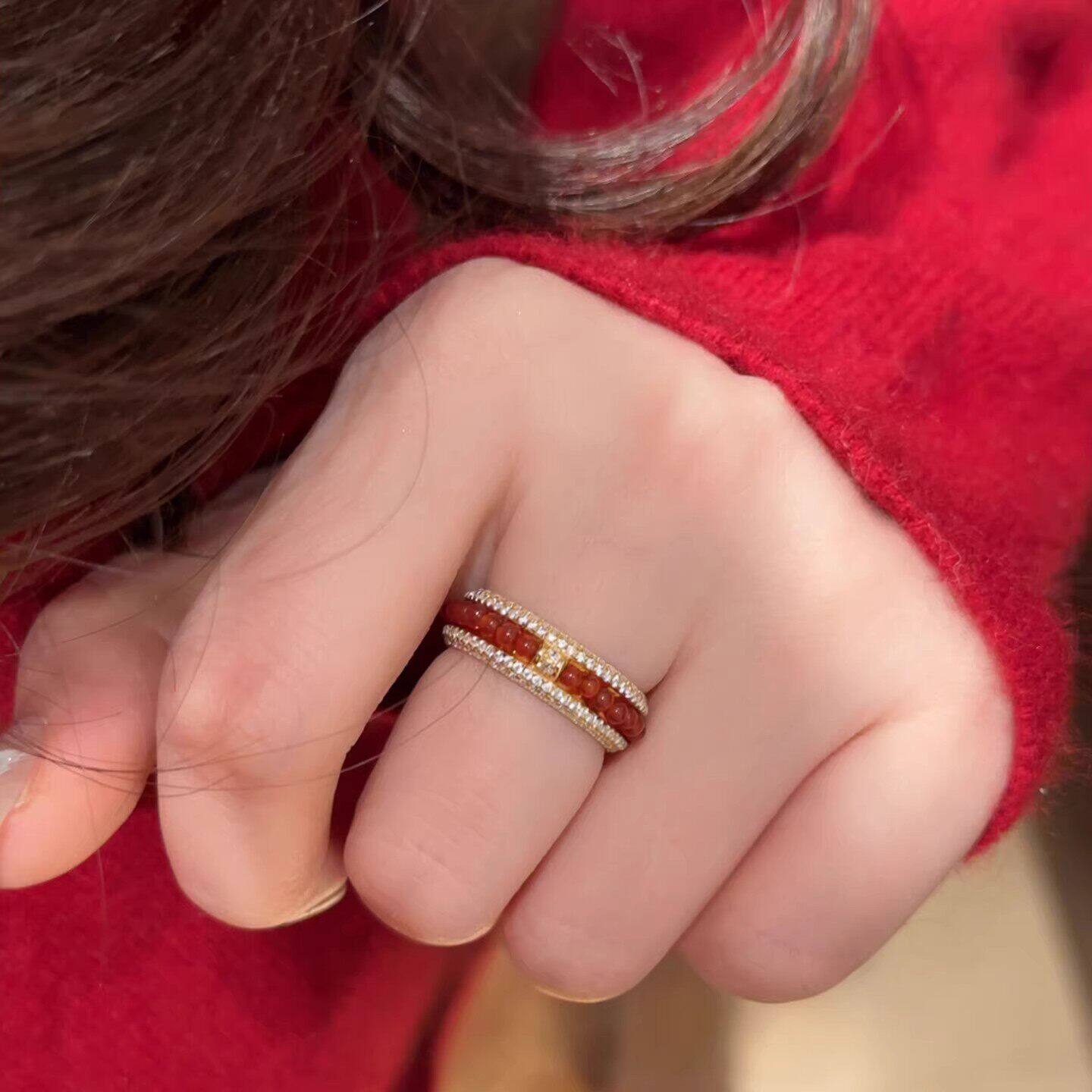 编织红色串珠仿满钻戒指女小众设计复古时尚指环高级感轻奢食指戒