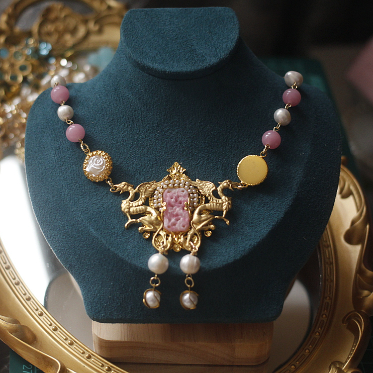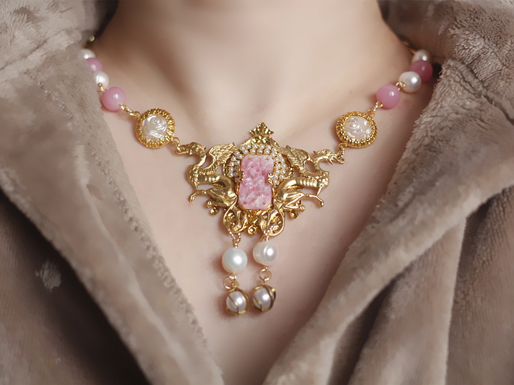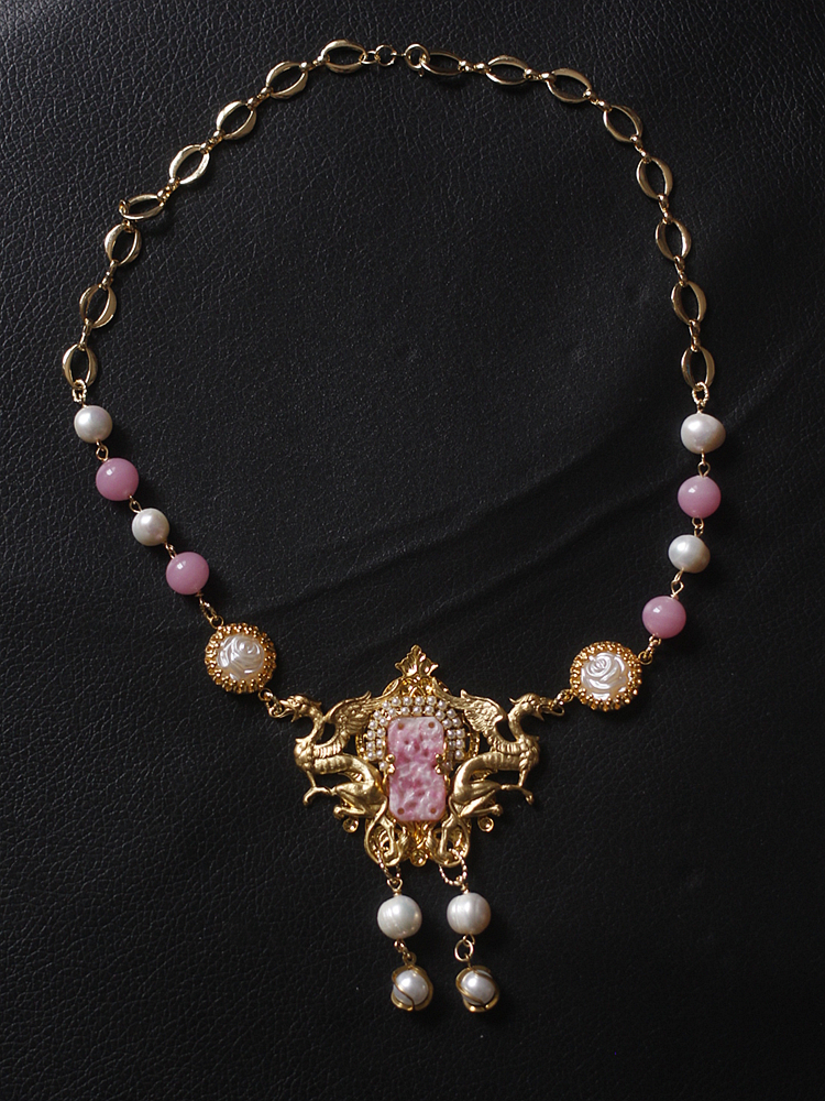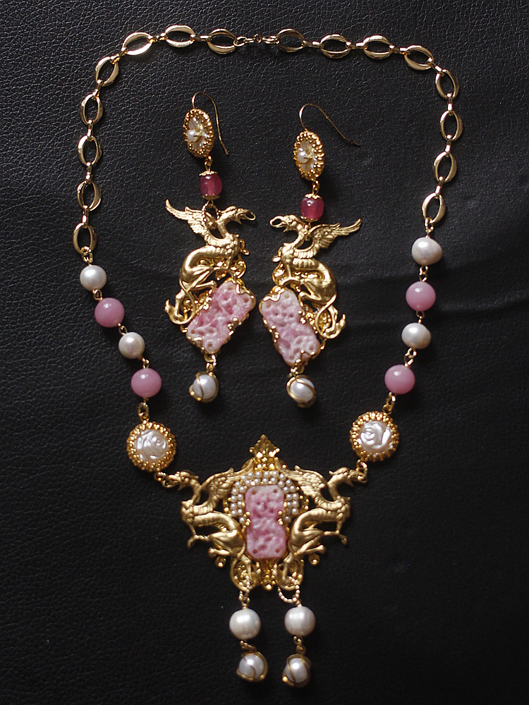 如意|欧美艺术家原创设计樱花飞龙中古粉老琉璃耳环夹项链Vintage