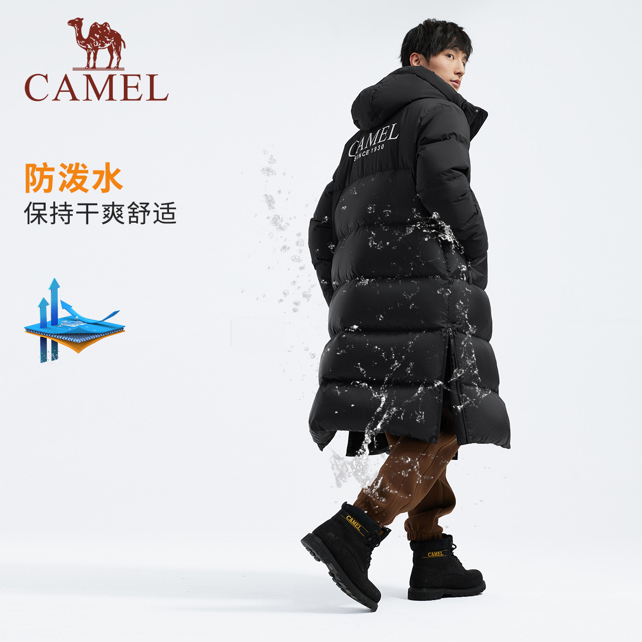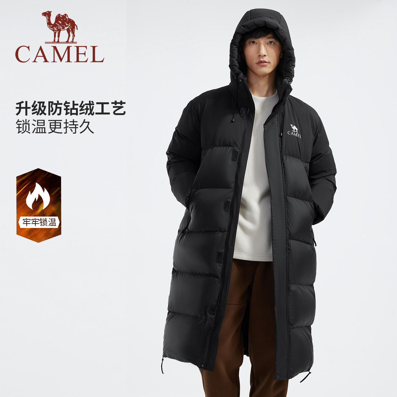 【三防体】骆驼男装黑色秋冬新款羽绒服男女同款中长款加厚面包服