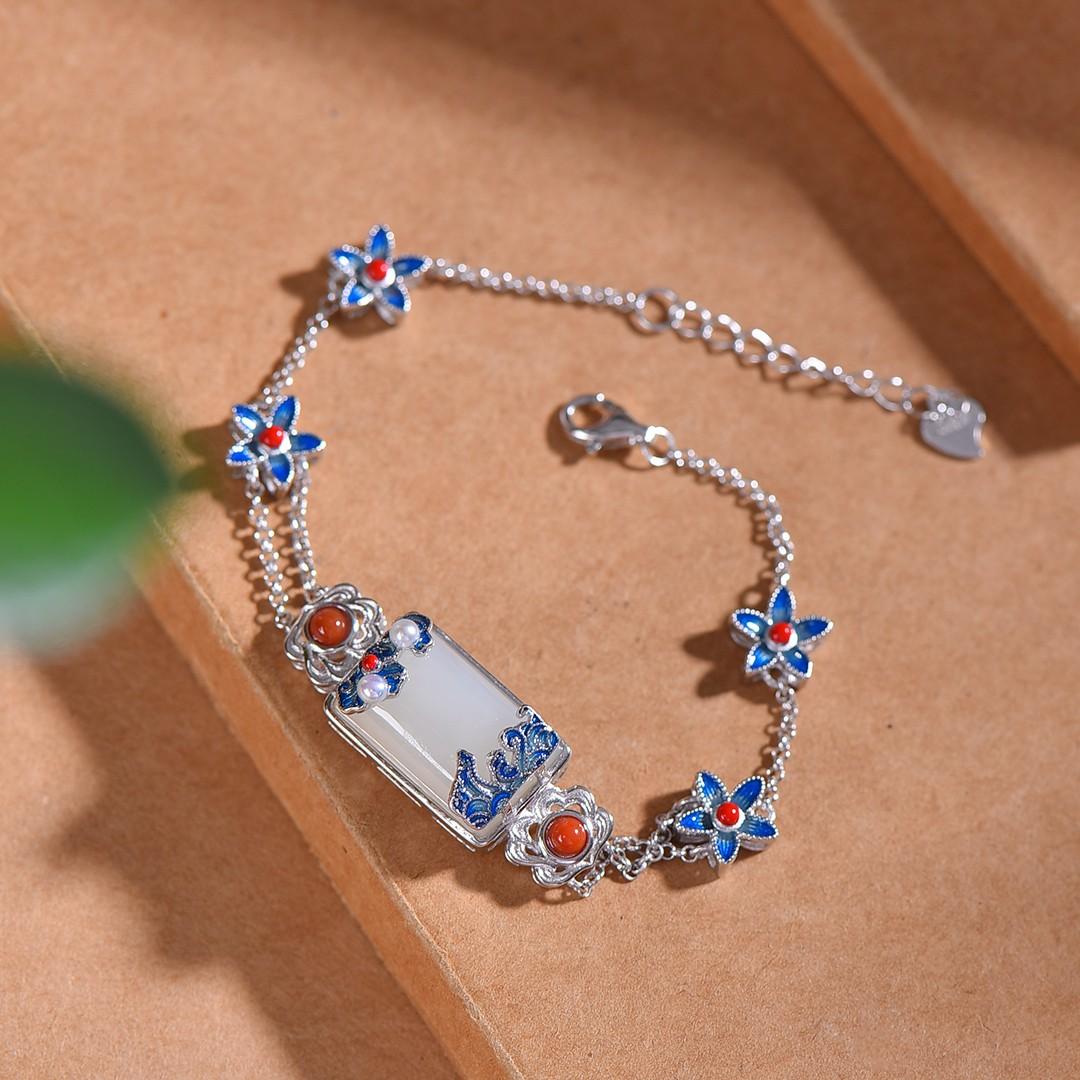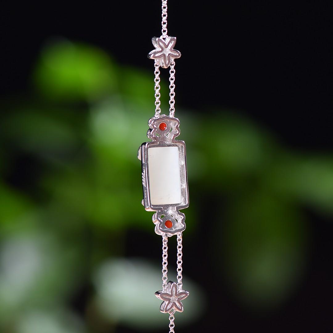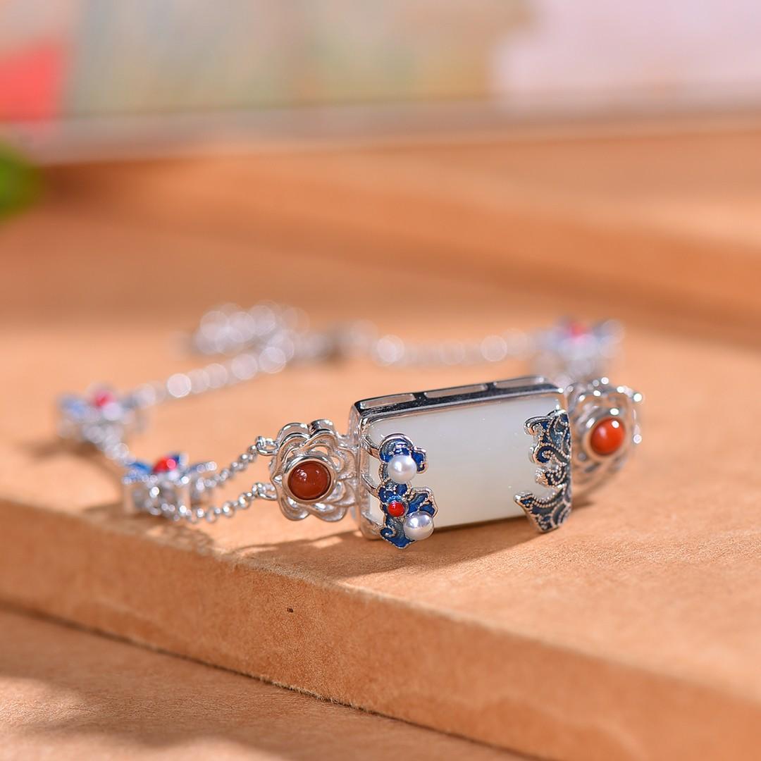 S925银镶嵌和田玉珐琅配南红手链2025新款爆款天然白玉手饰女士